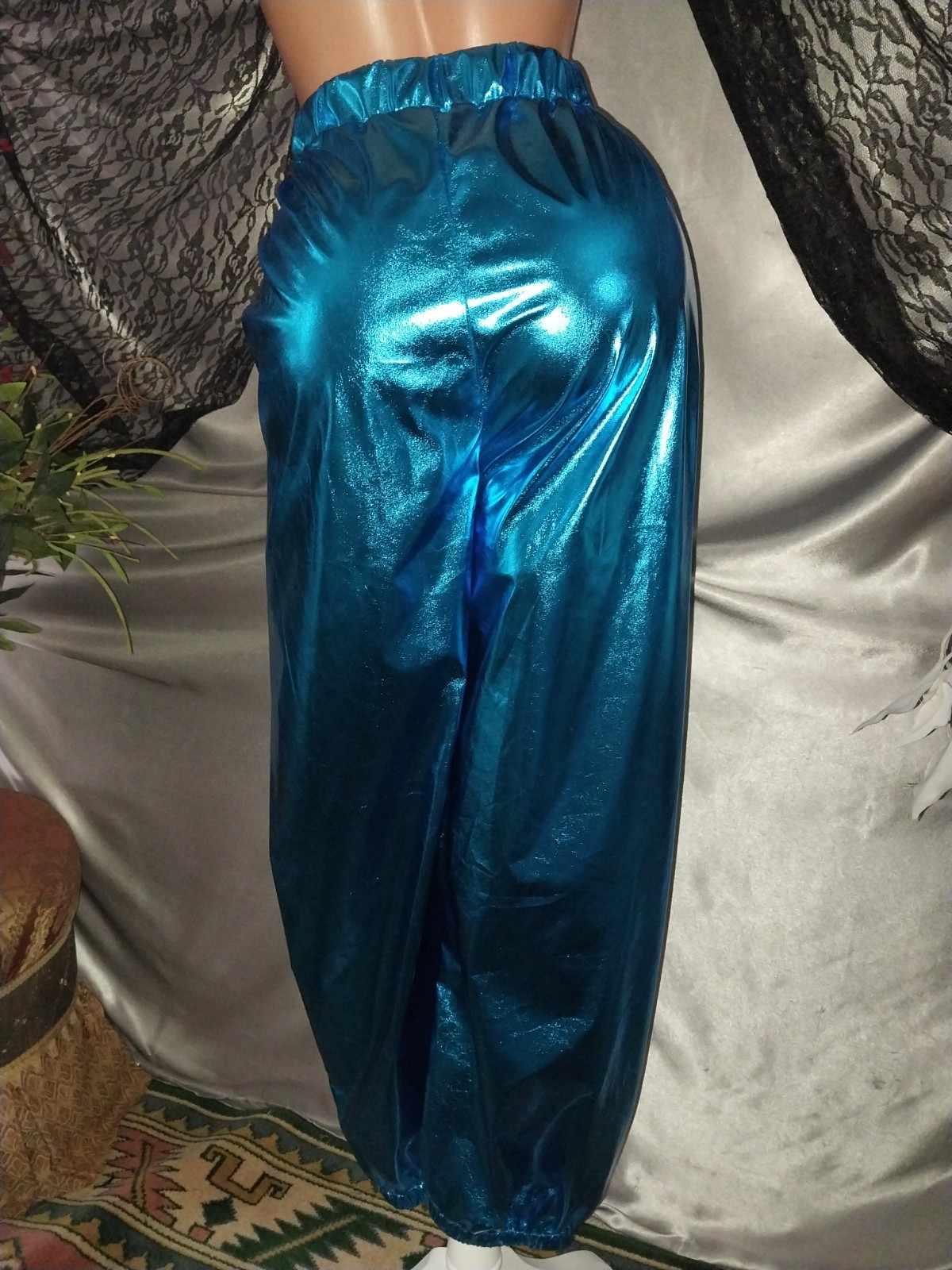 как выглядит VTG SATIN SHINY LIQUID FOIL BLUE PLUS FULL FIGURE 3X 4X PANTS NEW фото