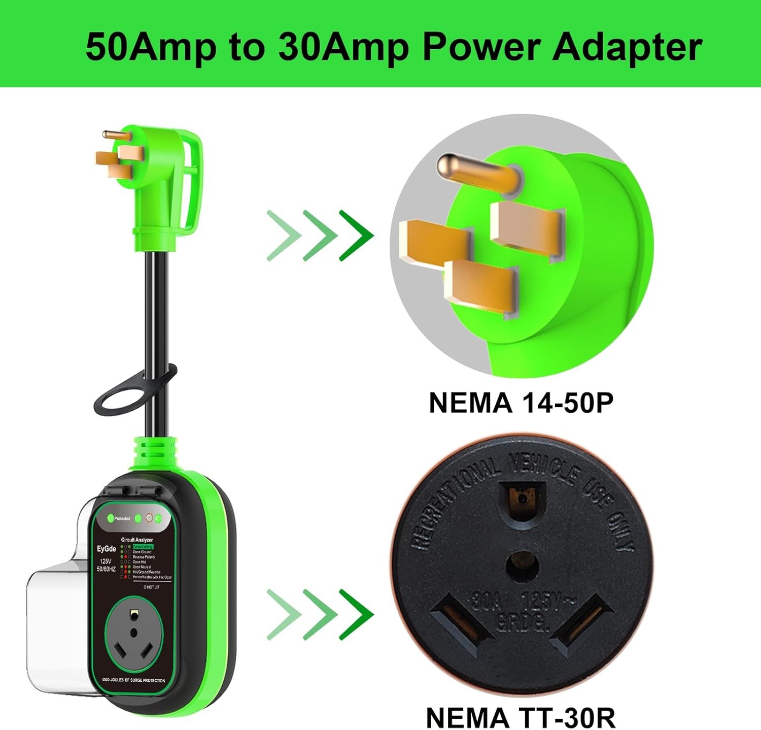 50 Amp to 30 Amp RV Adapter with Surge Protector, Patented Green 50M/30F
