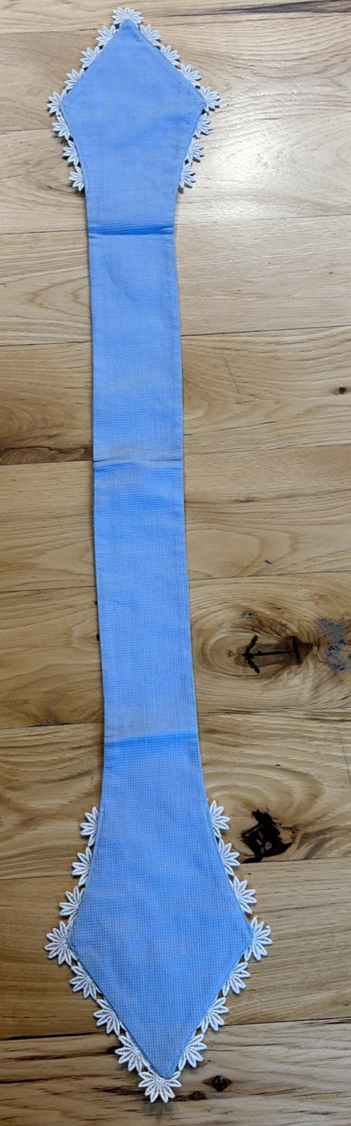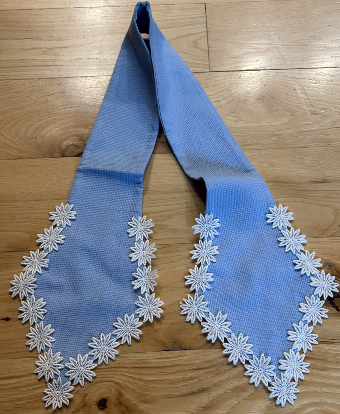 как выглядит Vintage Sash Or Fancy Clothing Trim 35" Long Blue With White Lace Flowers фото