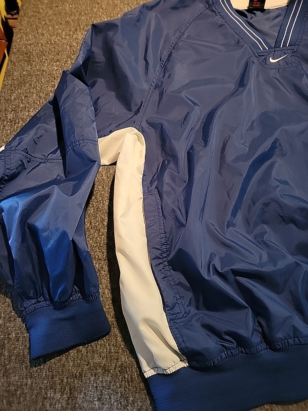 как выглядит Vintage Nike Sz XL V-NECK PULLOVER Windbreaker Center Swoosh Pockets Blue 90