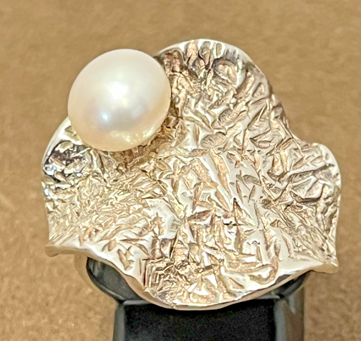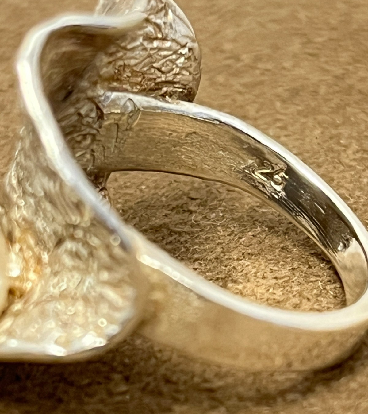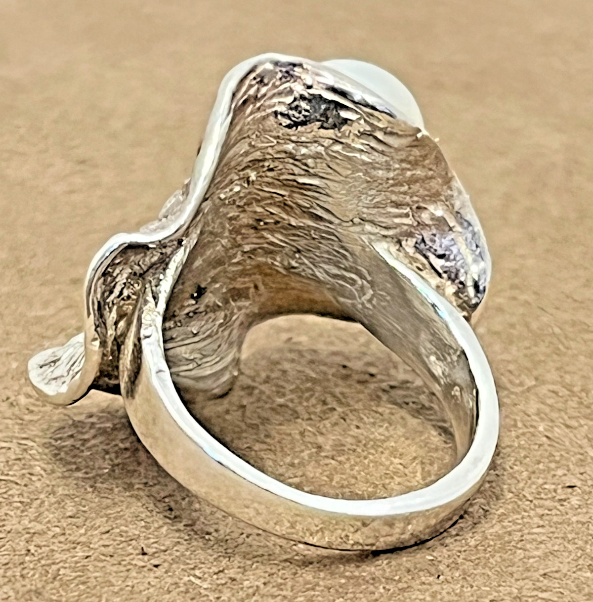 GORGEOUS STERLING SILVER HAMMERED FAUX PEARL ON LEAF STATEMENT RING size 6.25
