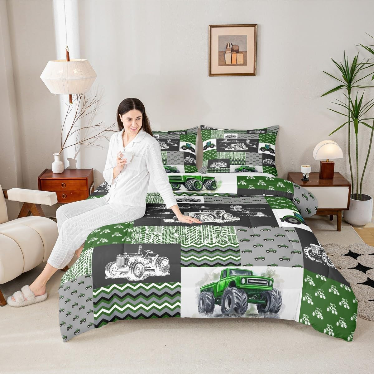 Green Tractor Comforter Set Full Size Farm Vehicle Truck Bedding Set Cartoon Equ