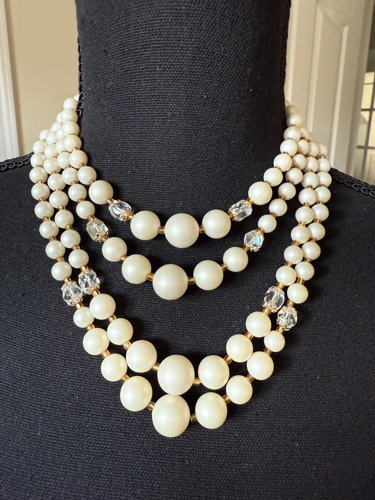 как выглядит Vintage 4 Strand Cut Crystal and Faux Pearl Necklace Signed Japan фото