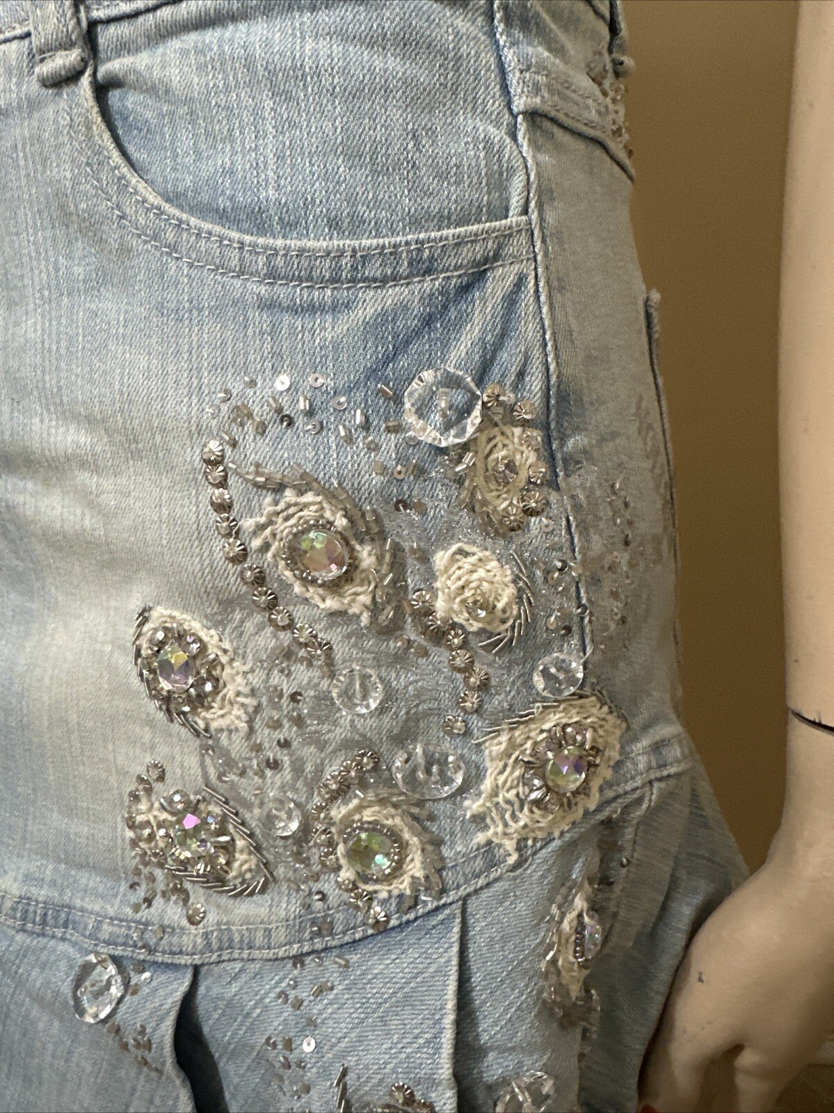 как выглядит Women s Light Blue Cotton Denim Casual Stretch Slim Beaded Zipper Size S Skirt фото