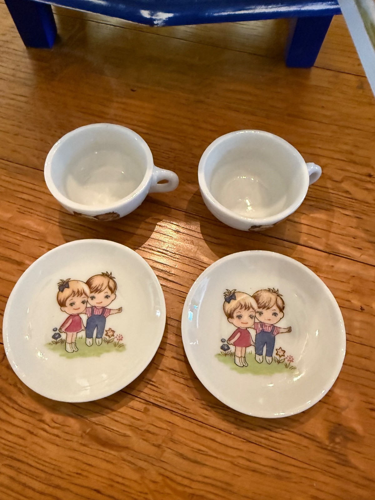 Vintage Lot 16 Pcs. Porcelain Mini Tea Set Japan Little Boy Girl with Hutch