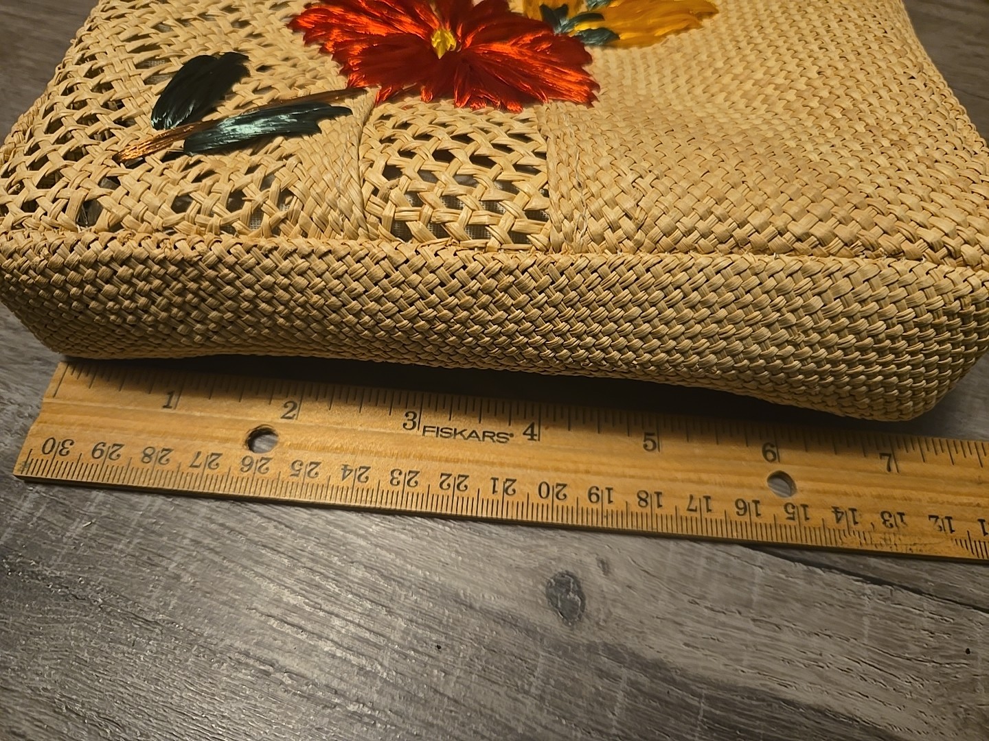 Vtg Raffia Straw Woven Purse Hand Bag Tote Embroidered Flowers 60s 70s Boho