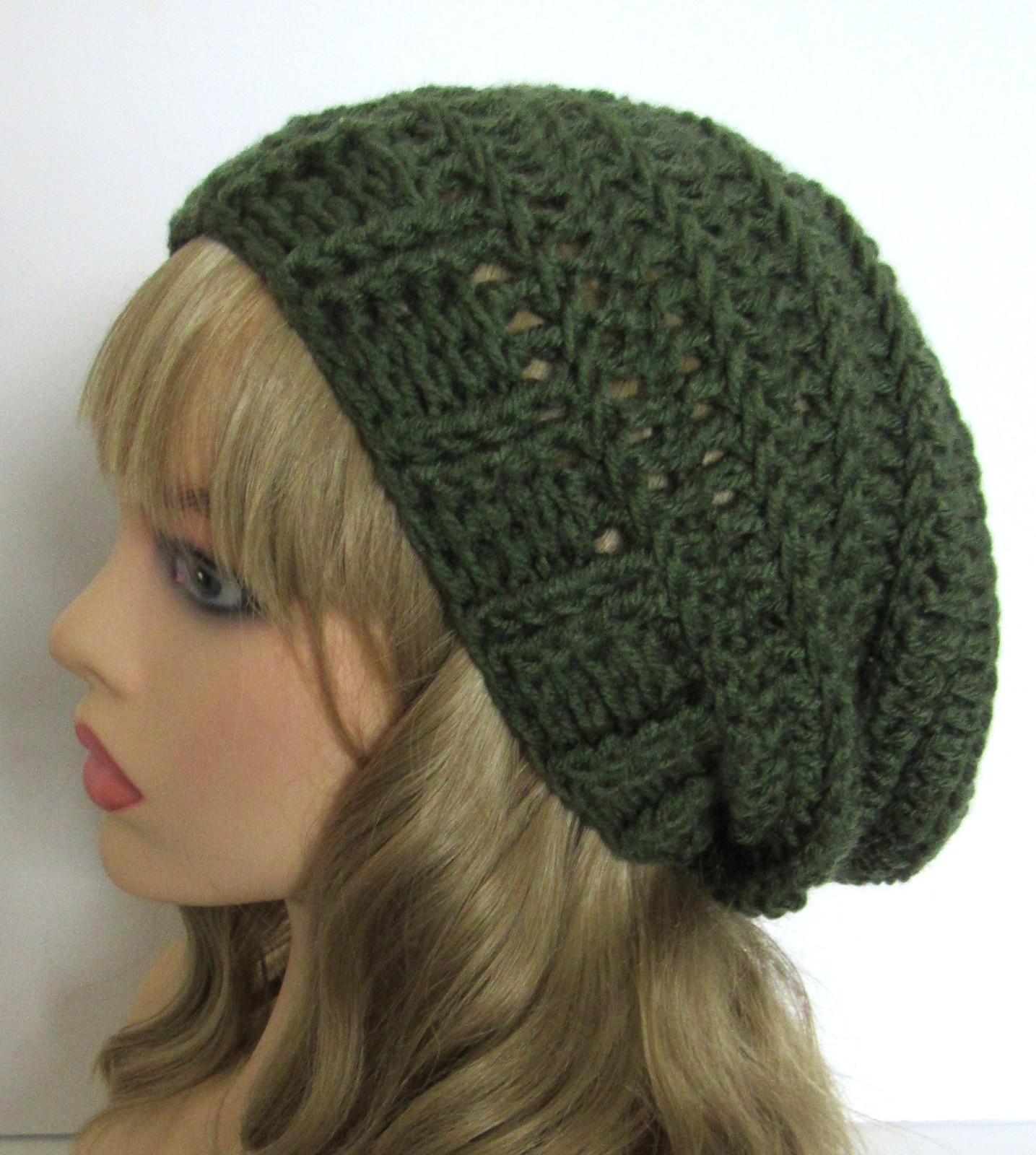 как выглядит SLOUCHY BOHO BEANIE HAT RIBBED MEDIUM GREEN TEXTURED EDGE HANDMADE CROCHET фото
