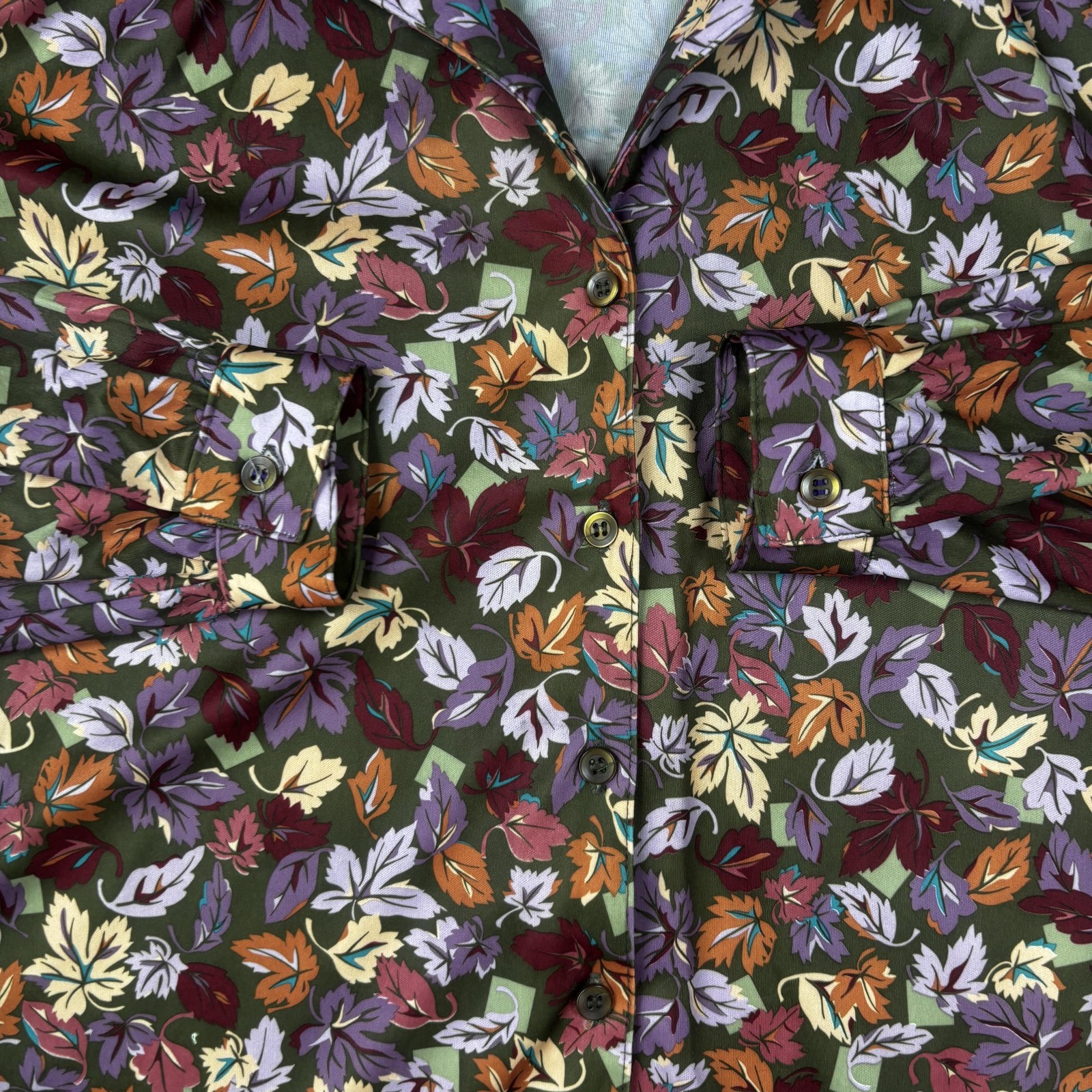 Vintage Sears Shirt Womens 18 Green Leaf Print Polyester Button Perma-Prest 70s