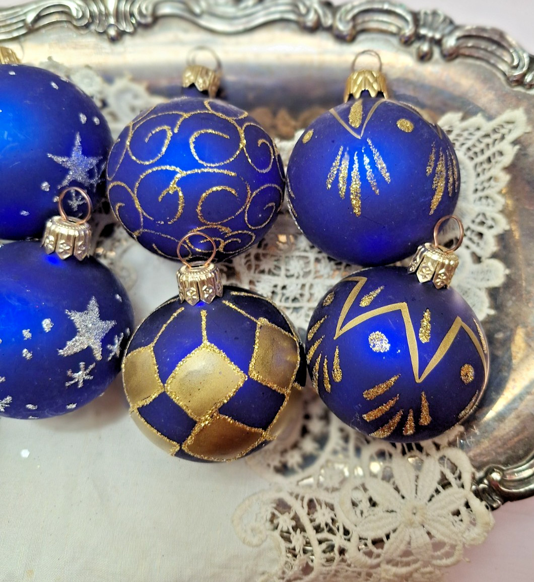 Glass Christmas Ornaments SMALL Tree Blue with Stencil Set of 8