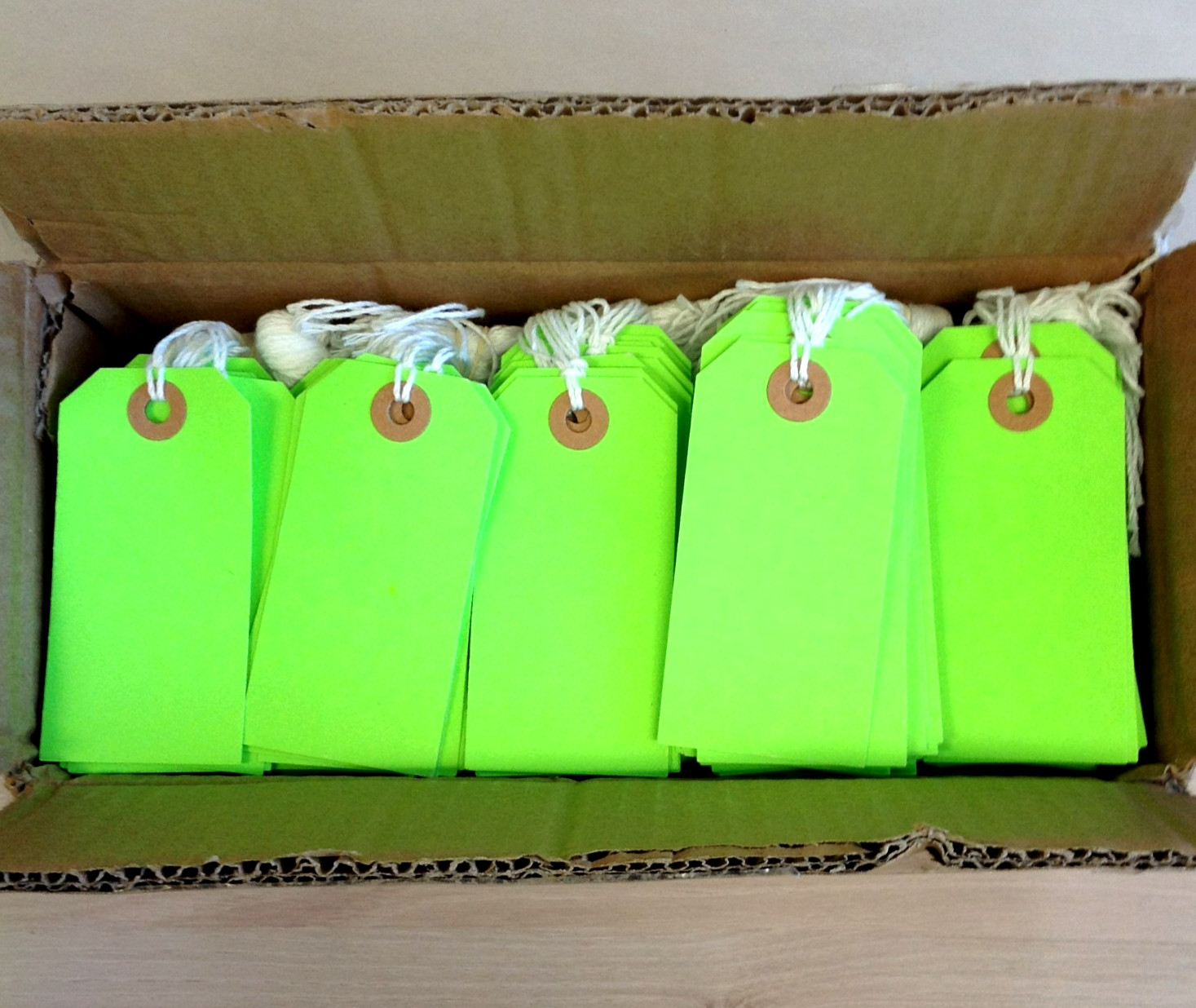 как выглядит Box of 1000 3-3/4 x 1-7/8 FLUORESCENT GREEN Shipping Tags Strung 13 Pt. G12032B фото