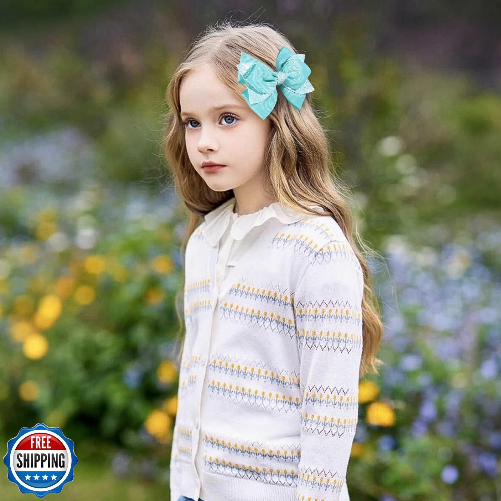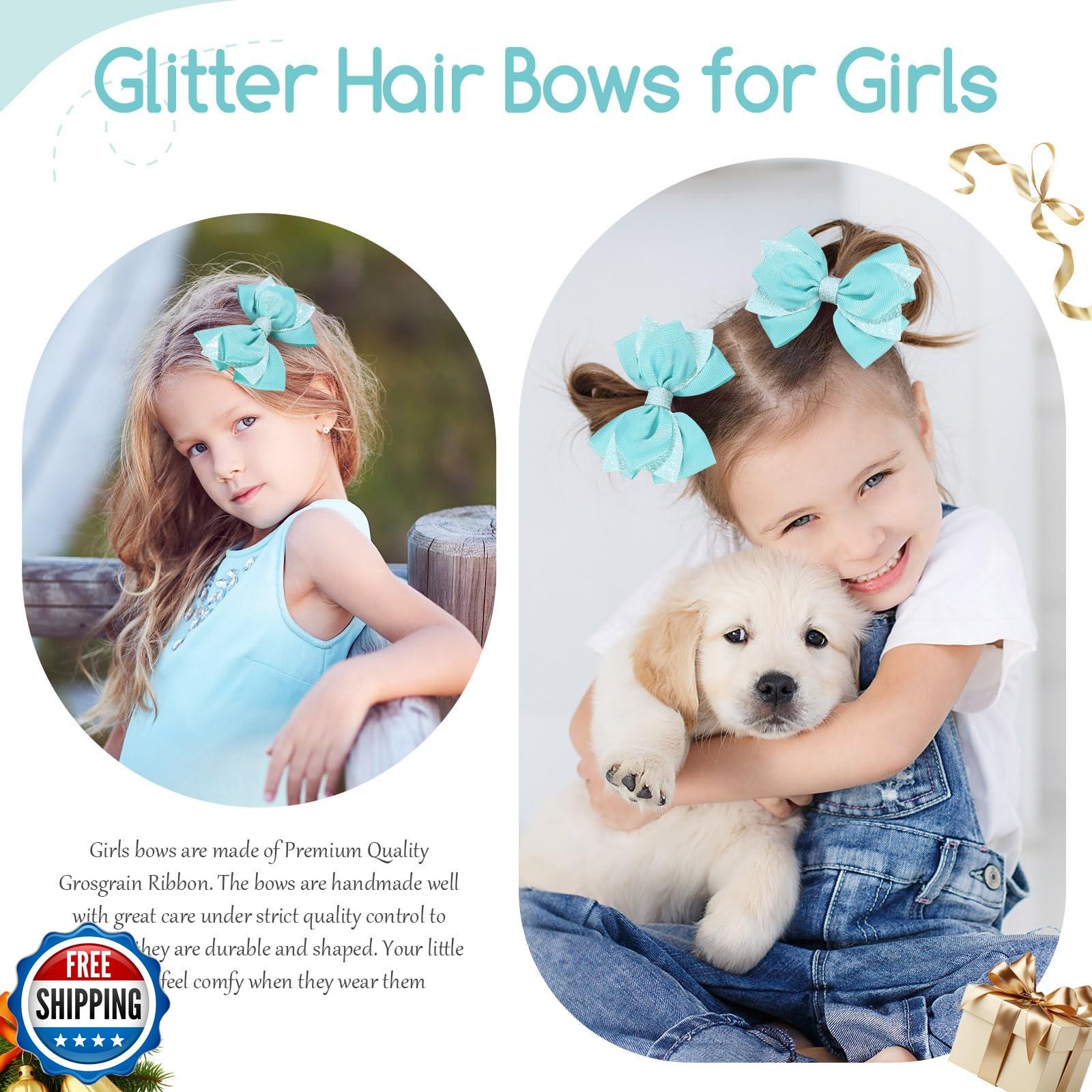 NCMAMA 4 Inch Sparkly Glitter Lake Blue Hair Bow Clips for Girls Boutique Seq