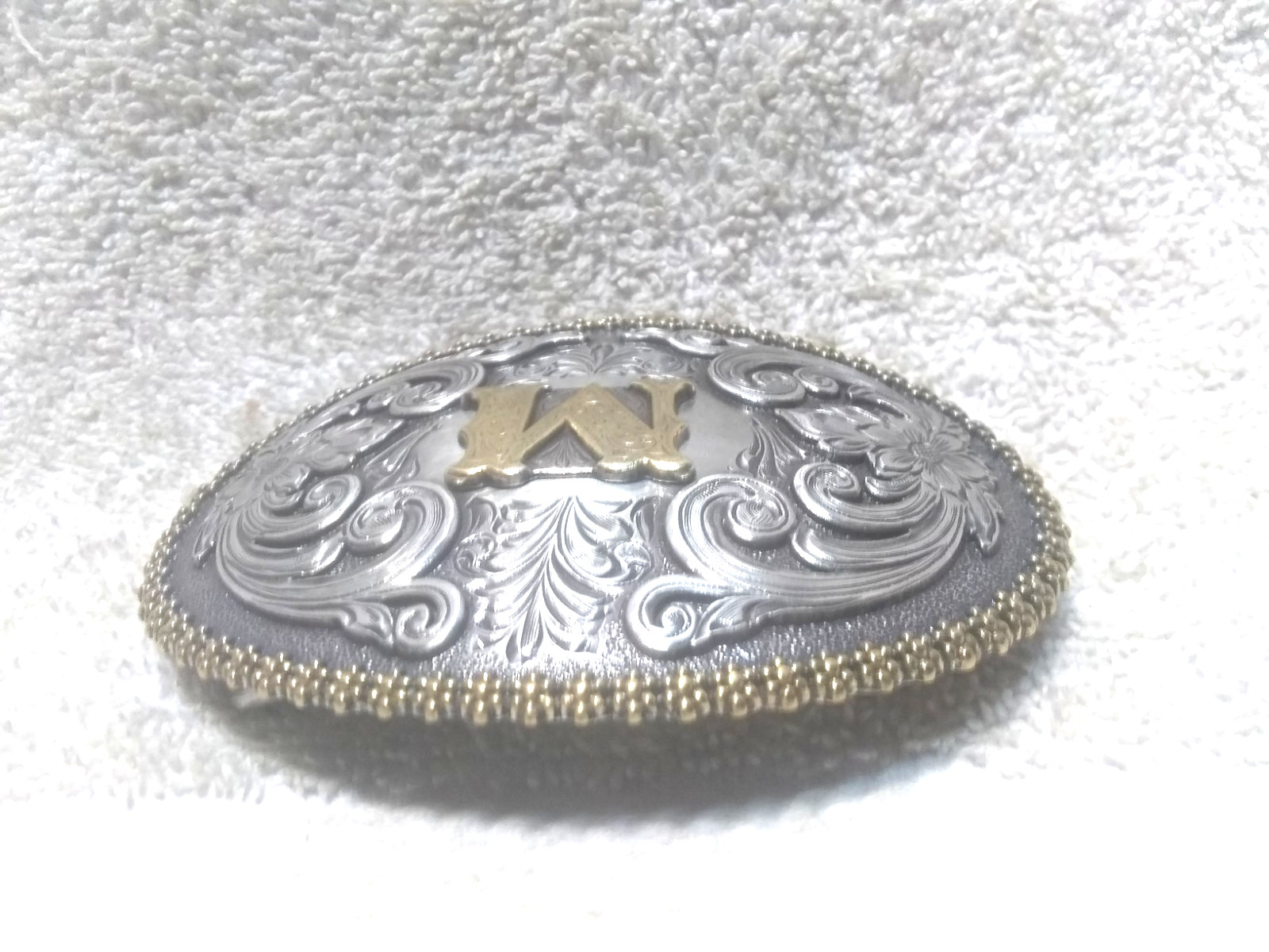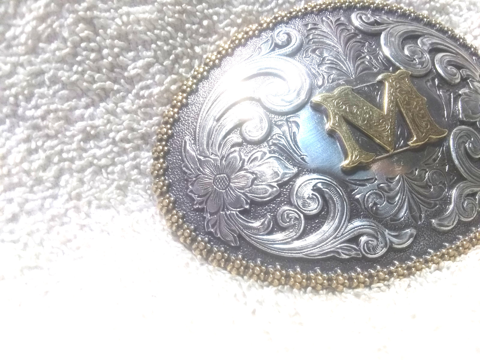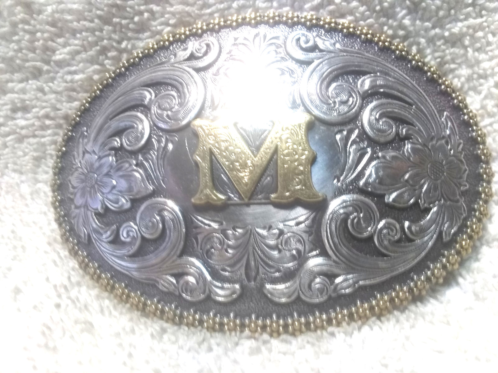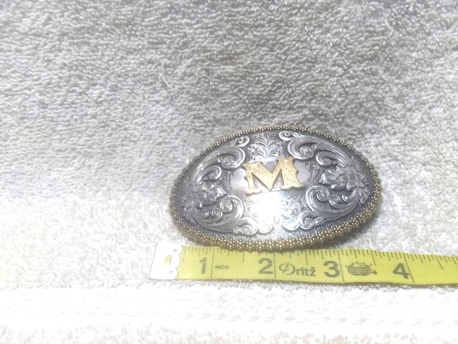 Nocona Letter M Buckle Silver Flowers Swirling Edge Gold Beaded Edge Great