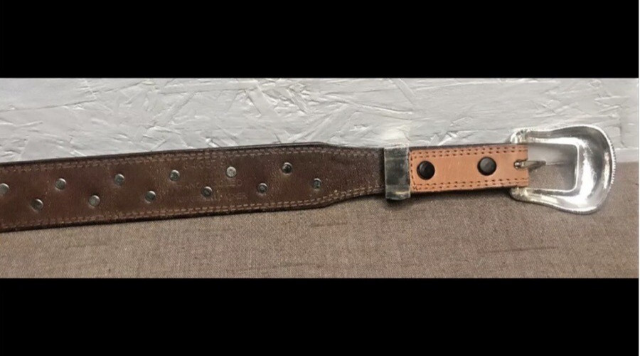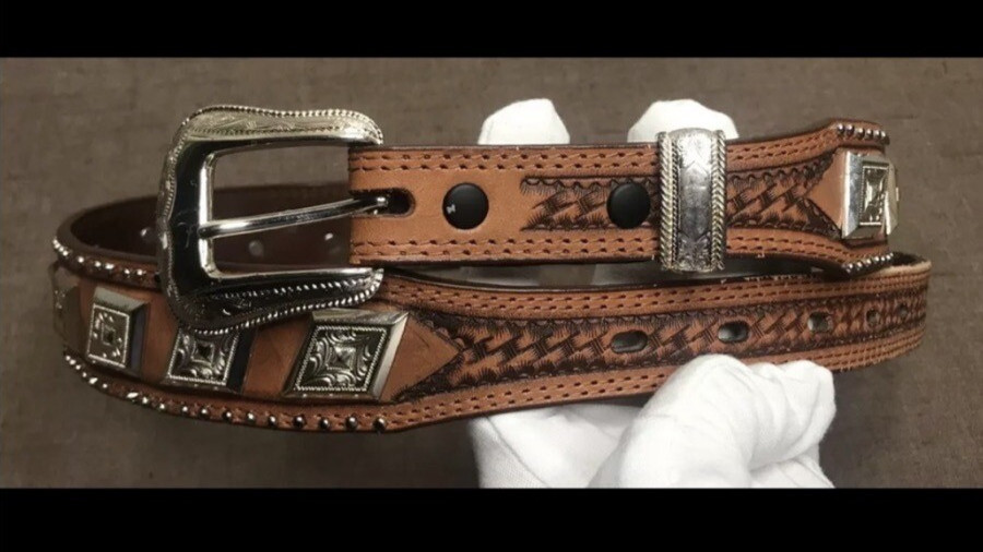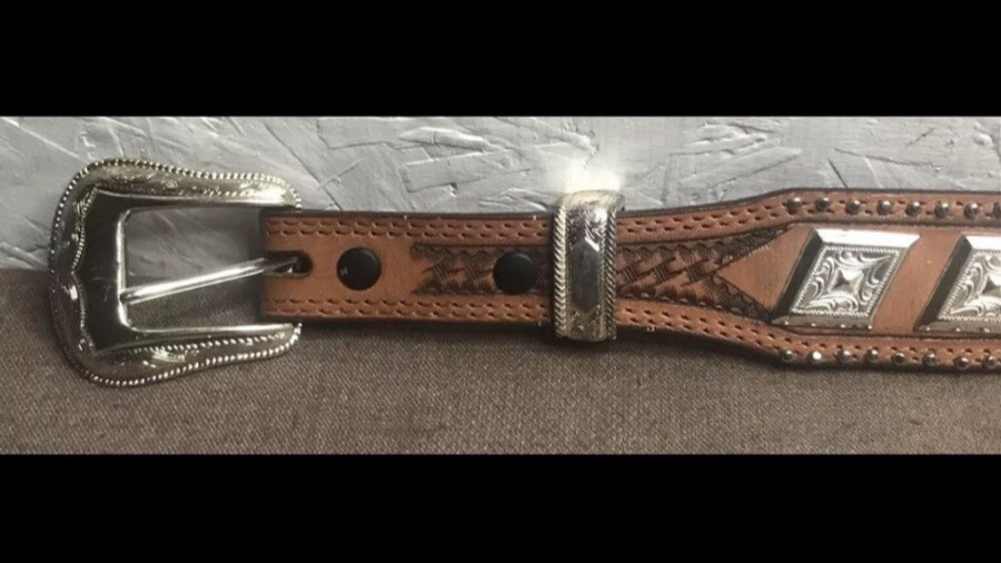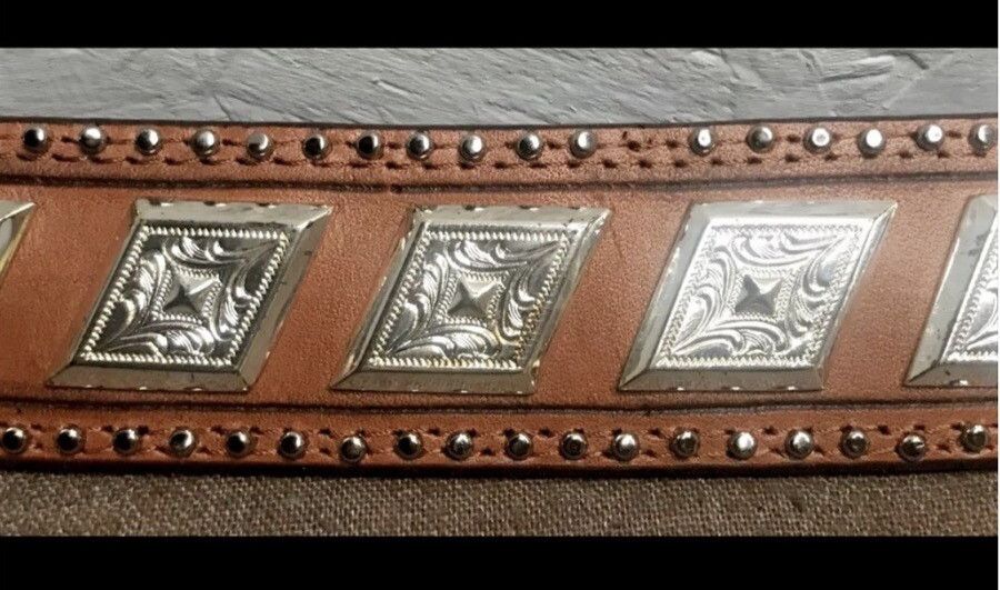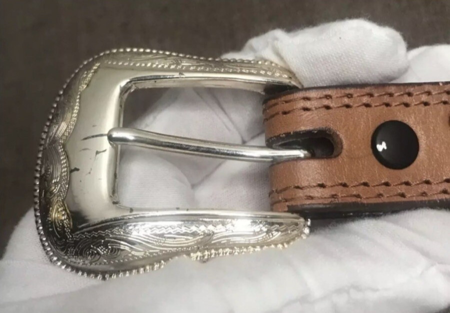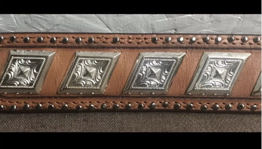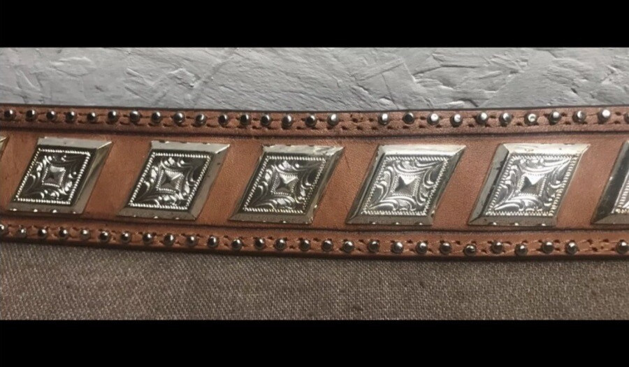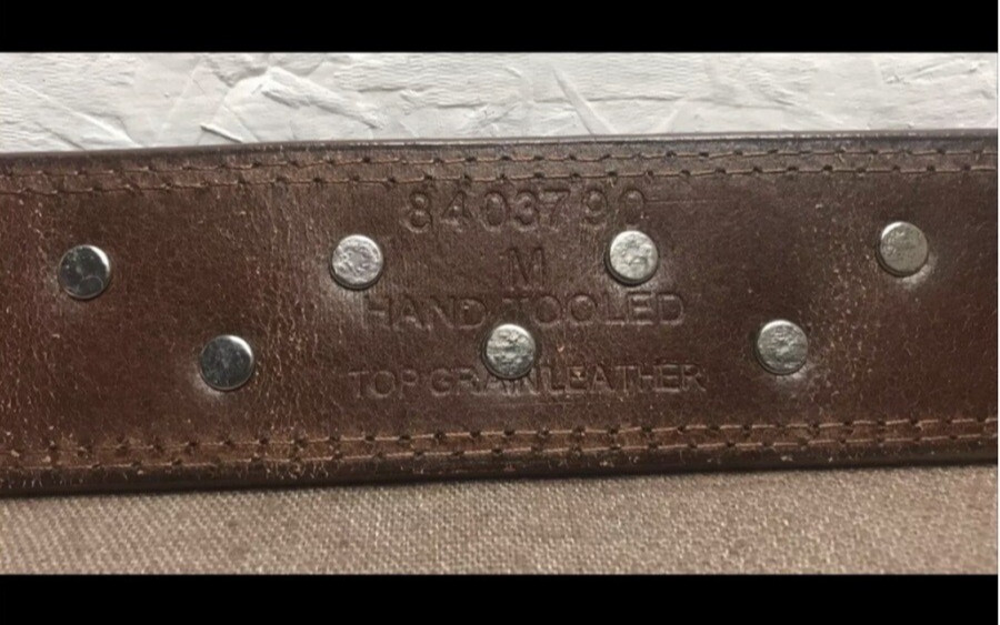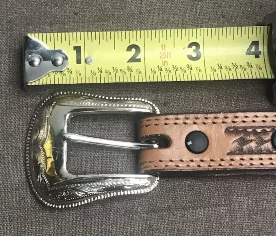 как выглядит Women s Brown Hand-Tooled Leather Belt Size Medium  Embossed Silver Hardware фото