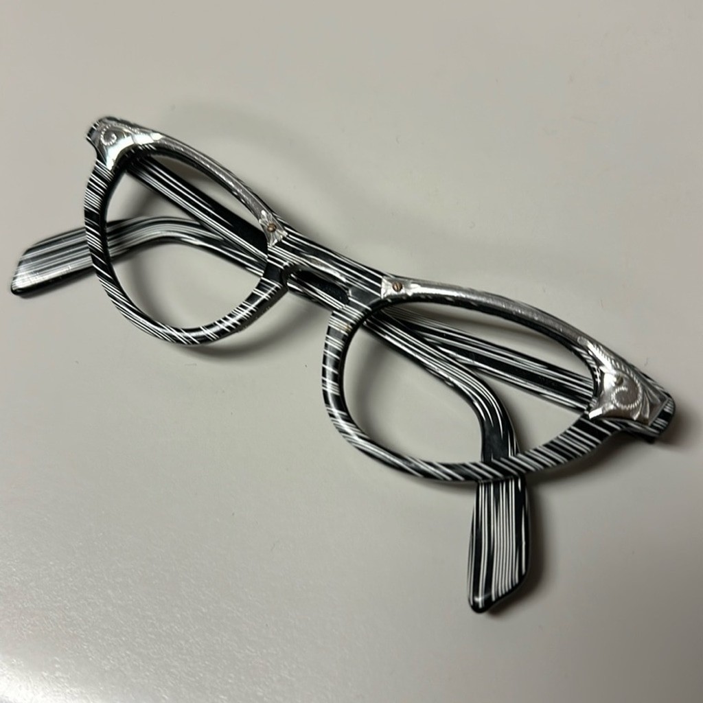 Vintage, stunning frames, glasses, black white striped, silver, trim rare cateye