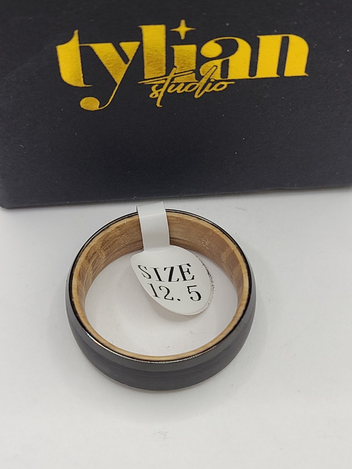 Tylian Studio Black Whiskey Barrel Ring Tungsten Wood Inlay sz 12.5