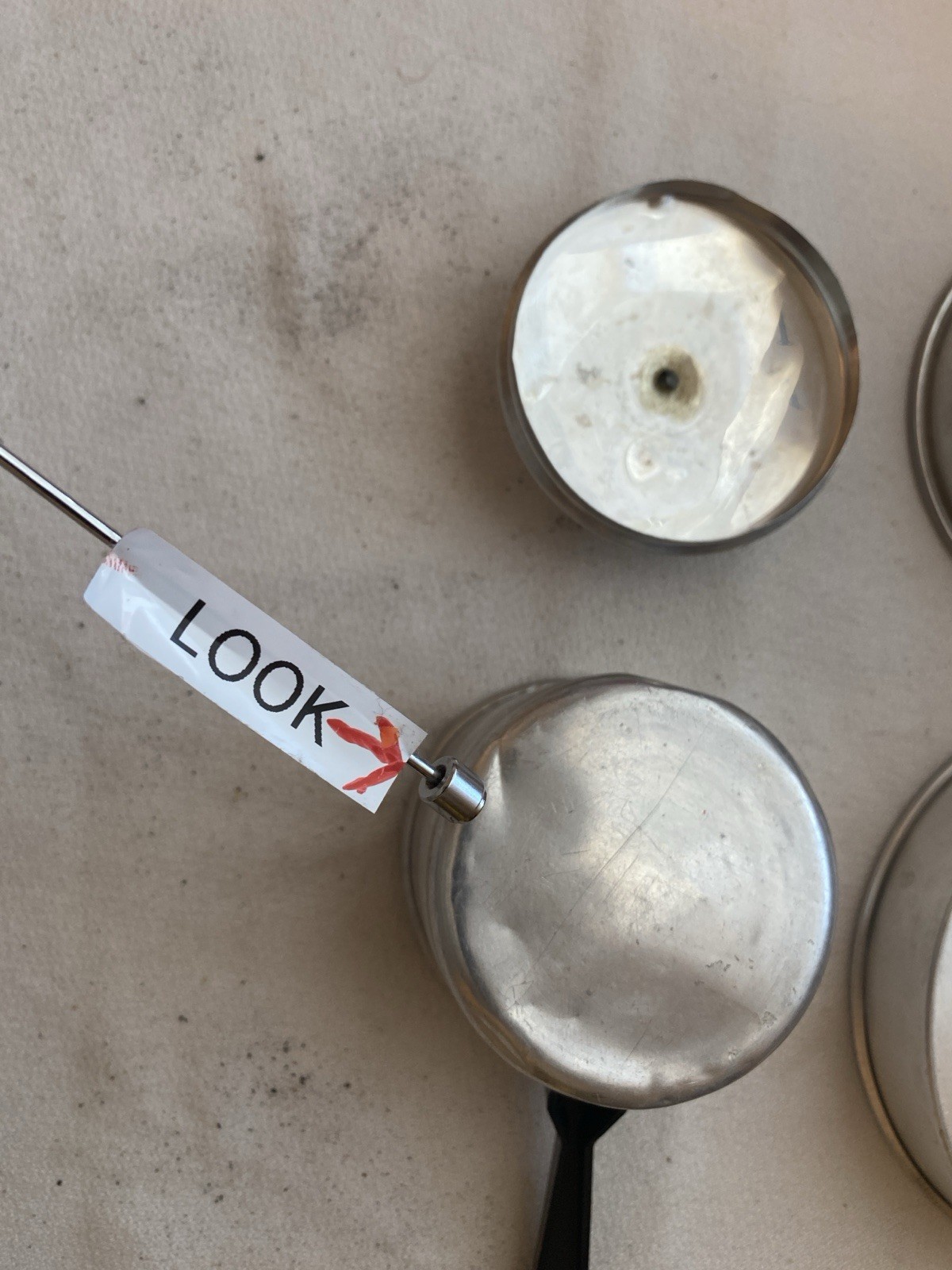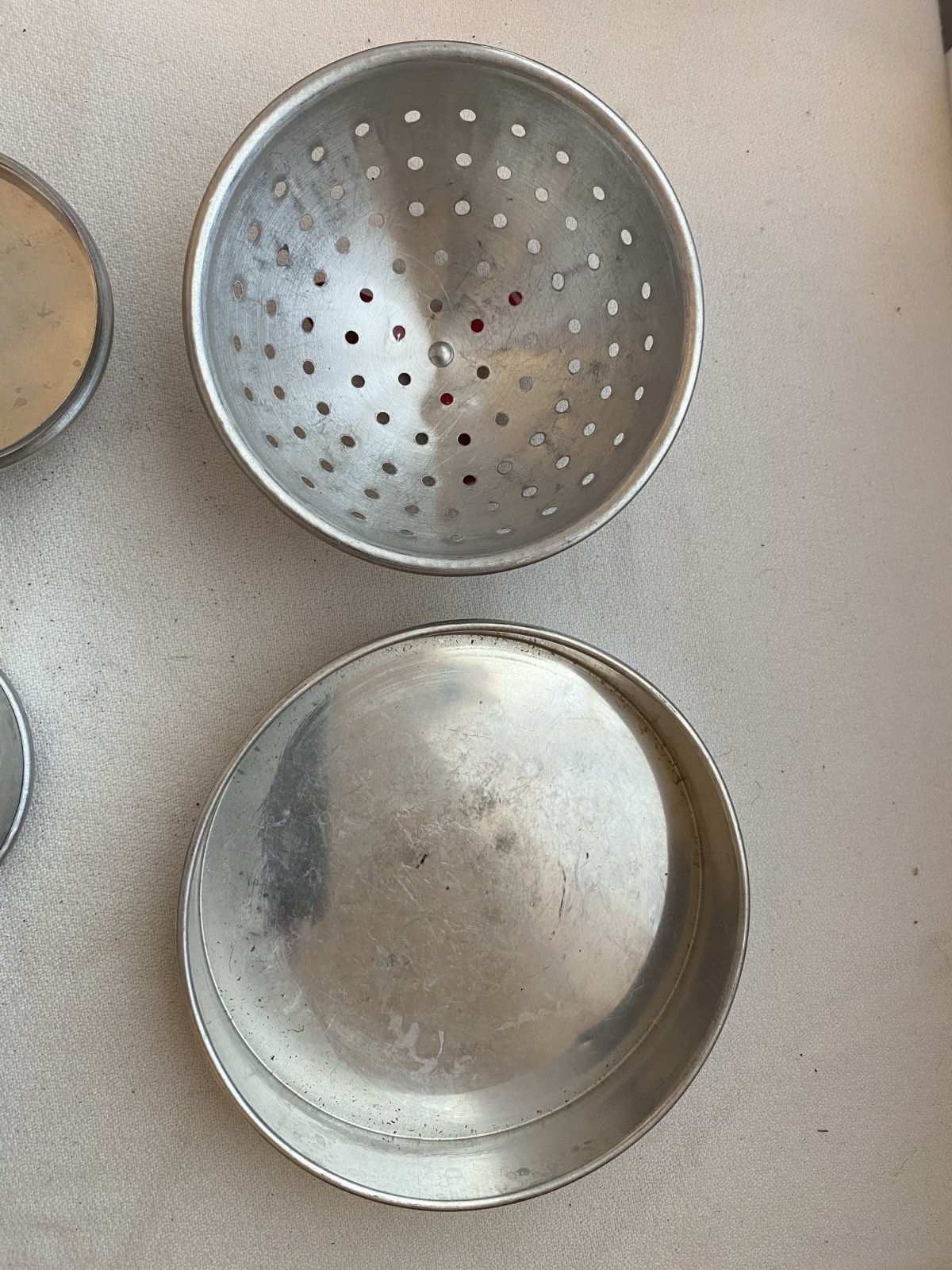 Lot 4 Pc Childrens Play Aluminum Red Colander 2 Frying Pans Black 1 Cake 2 Bonus