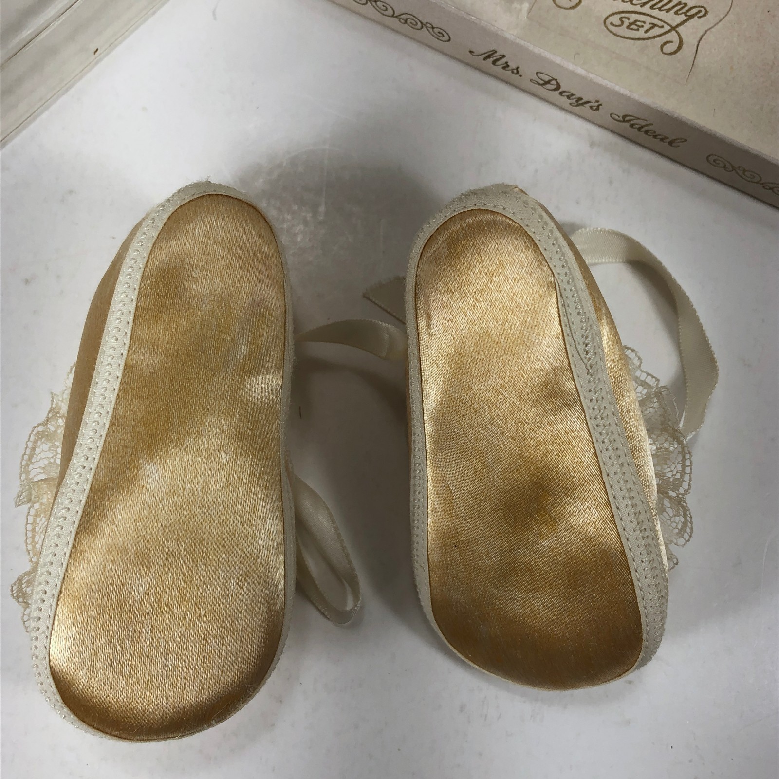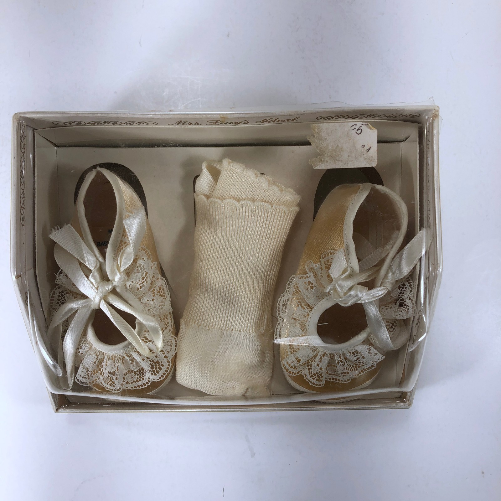 как выглядит VTG Mrs. Days Ideal Girl Baby Shoes Socks, White Gold Size 0 in Box 1960s фото