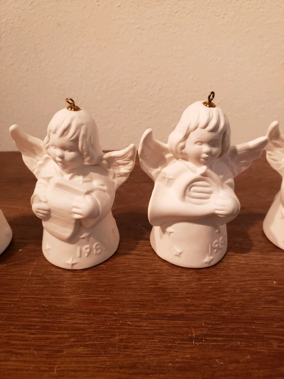 как выглядит Lot Of 8 Goebel White Angel Bell Annual Christmas Tree Ornaments 1977-1984 фото