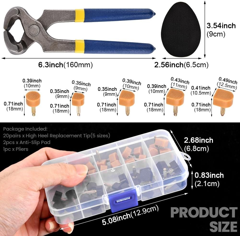 Included Components: High Heel Replacement Tips (5 Sizes), Anti-Slip Pad, Pliers