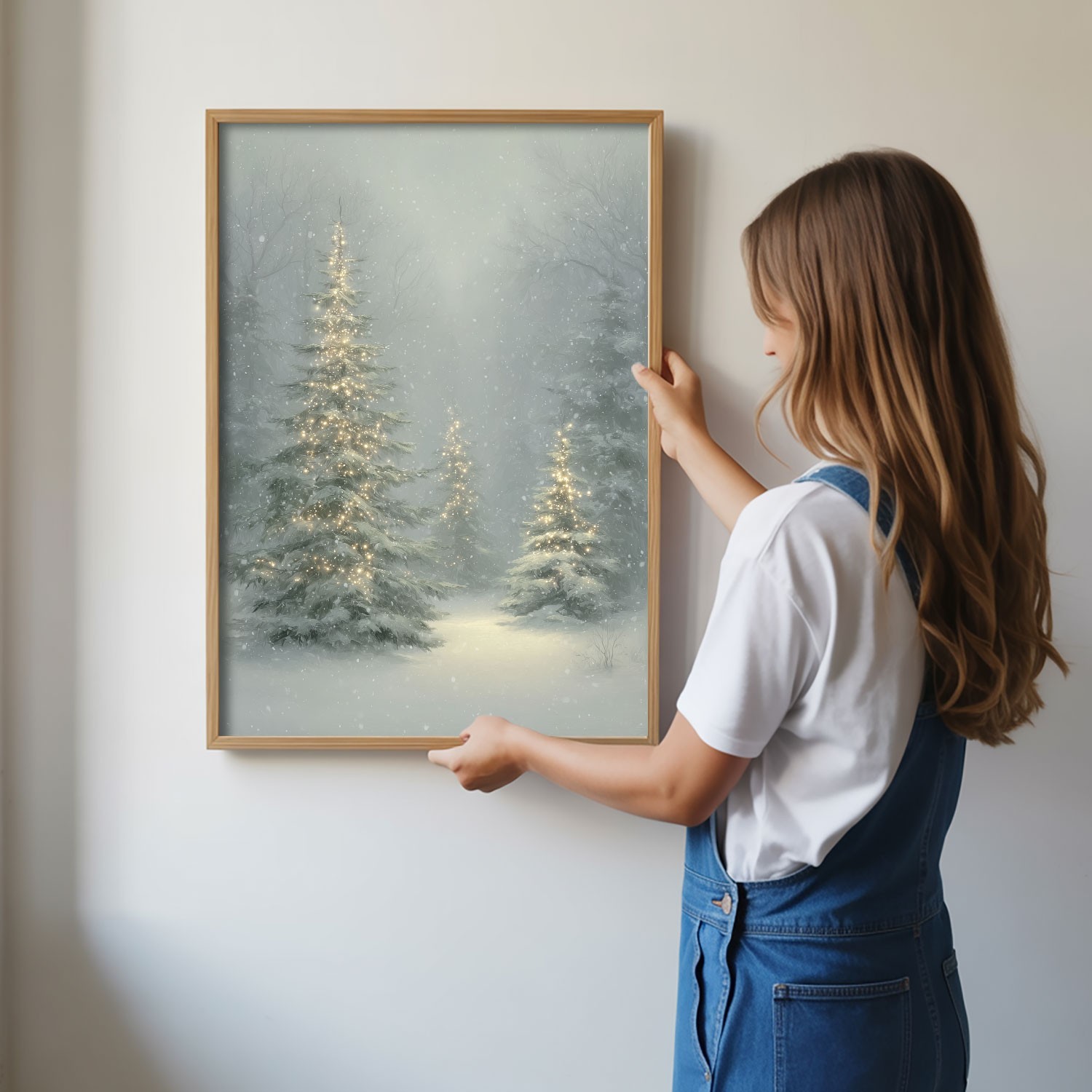 Christmas Tree Lights Wall Art Snowy Pine Painting Enchanted Forest Canvas