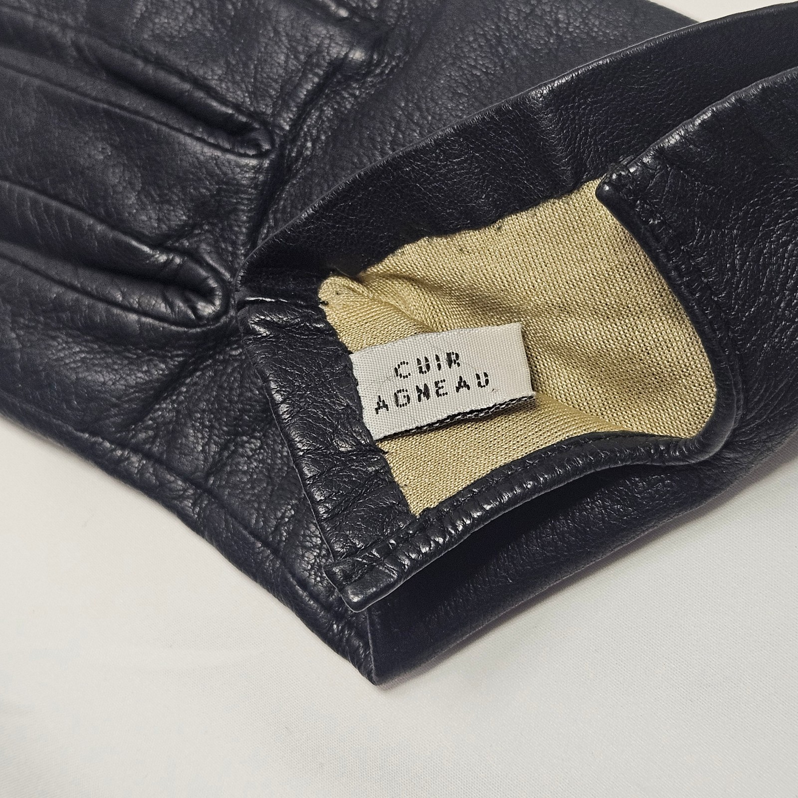 Vintage Women's Agnelle black lamb leather silk lined gloves, gold chain accent