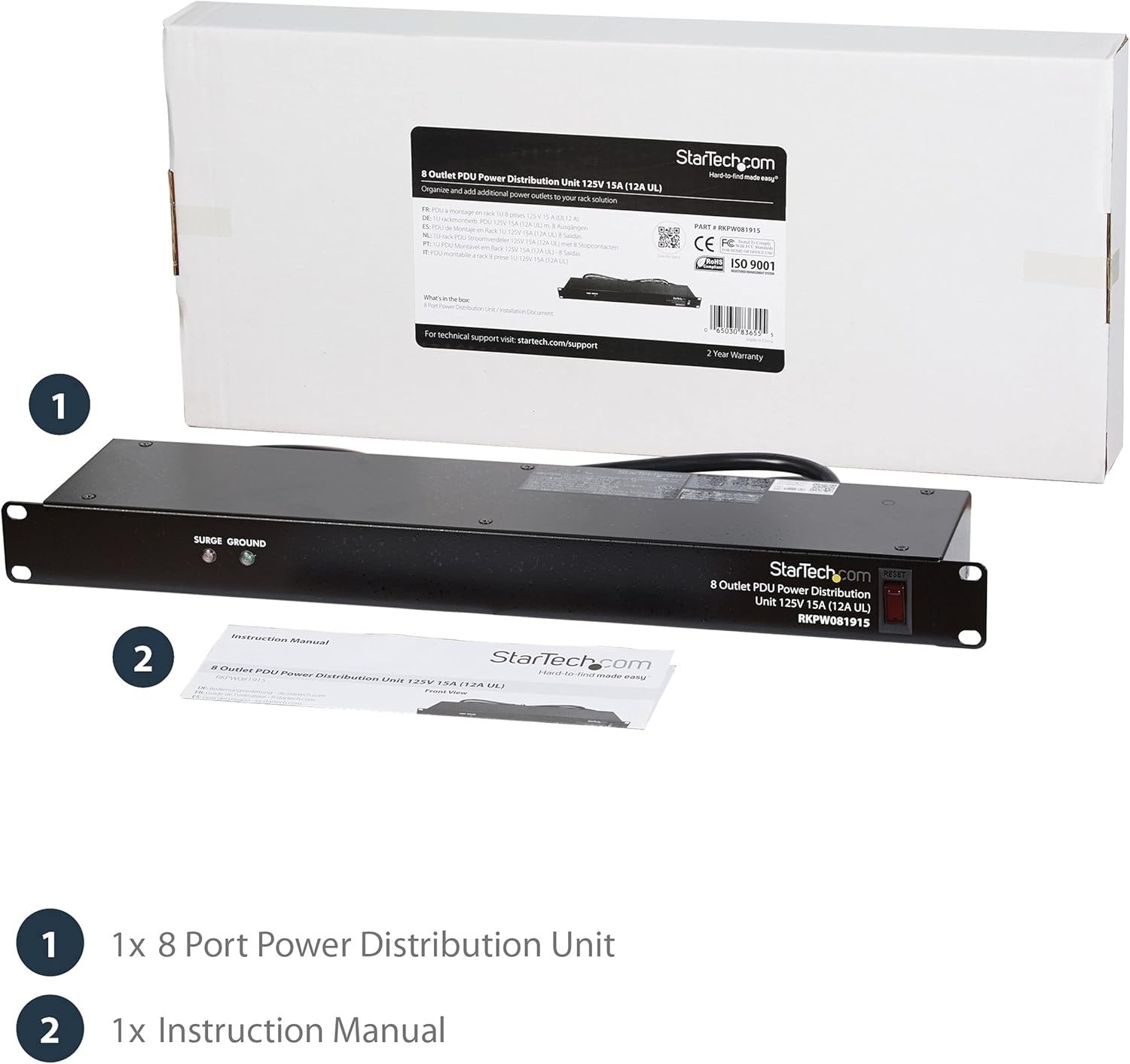 1U Rack Mount PDU Power Strip - 8 Outlets, Surge Protection