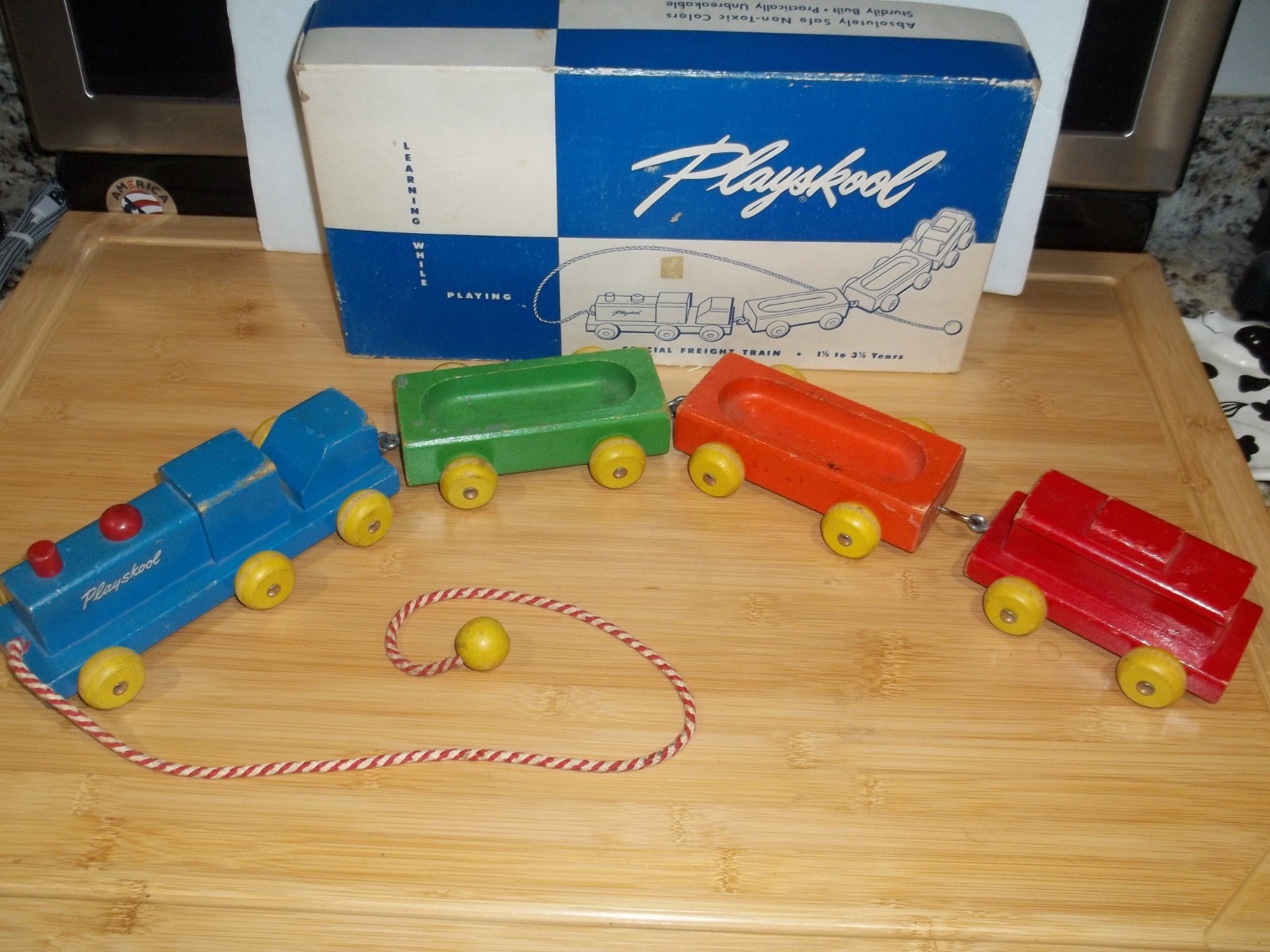 как выглядит 1950s Playskool Wooden Pull Toy Special Freight Train Set No. 415 W/Box фото