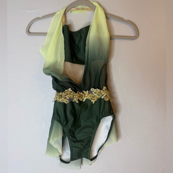 Weissman Elite Draped Halter Green Mesh Dance Leotard Costume NEW Large Child