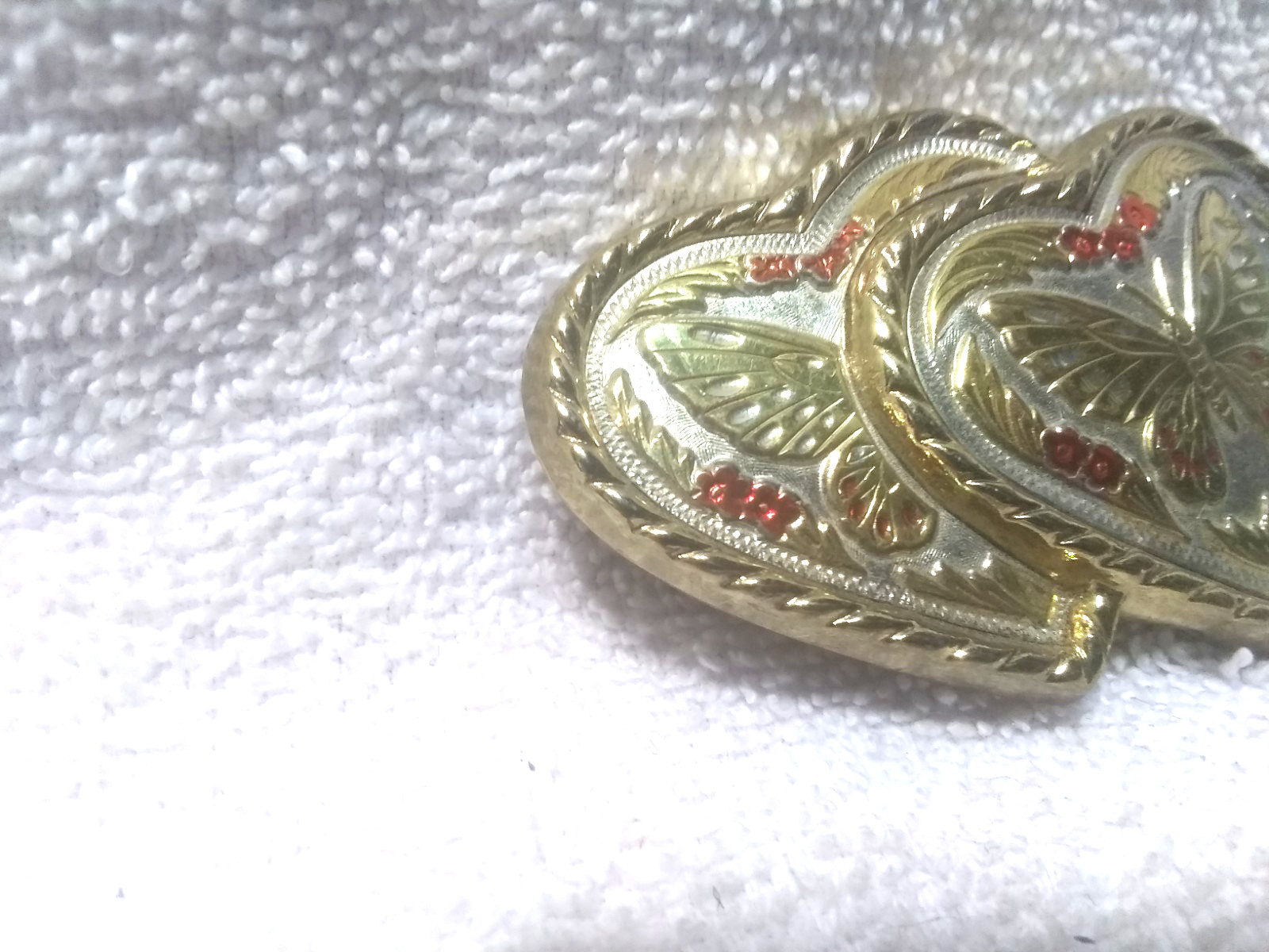 Double Heart Center Butterfly Gold Edge W Brand Buckle USA Made Vintage