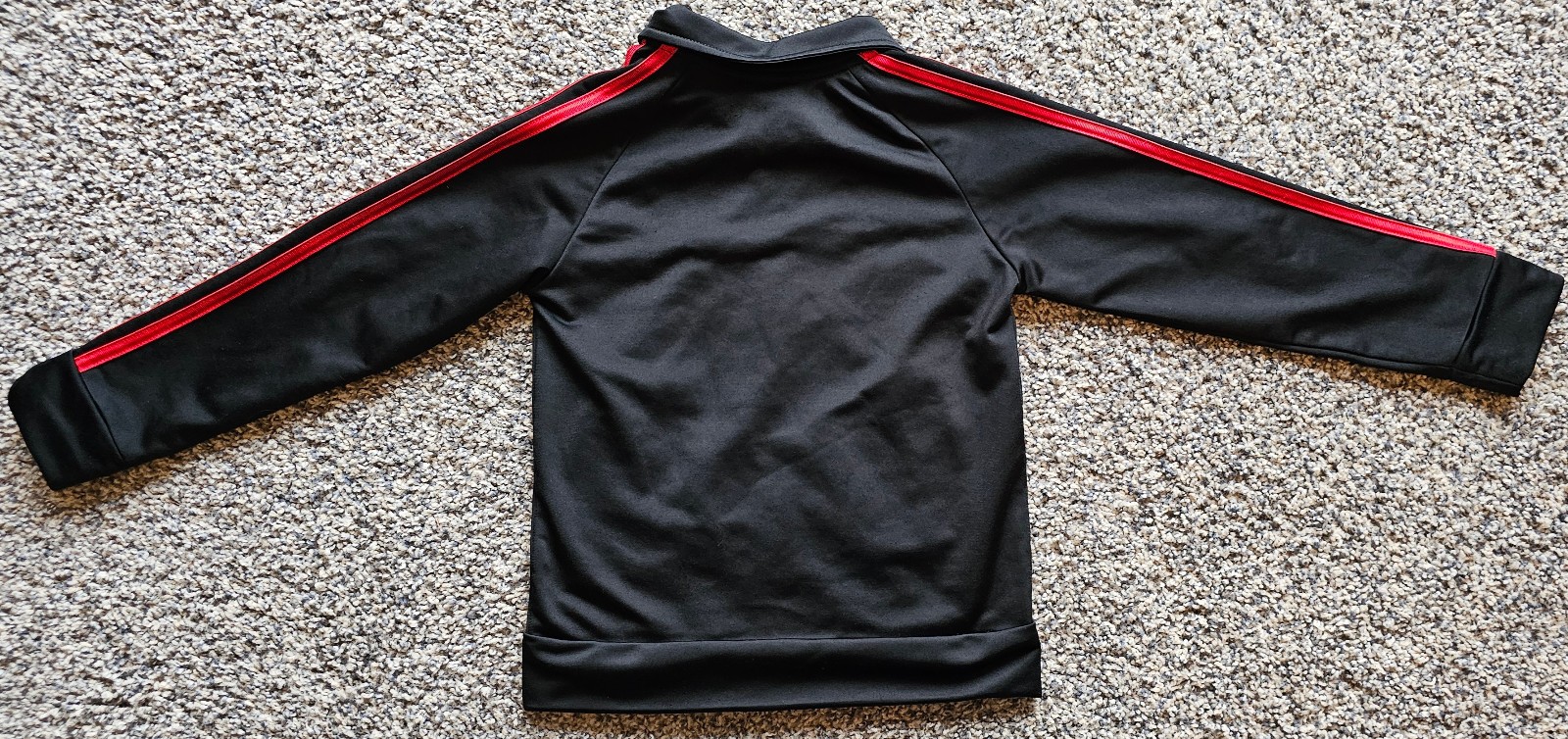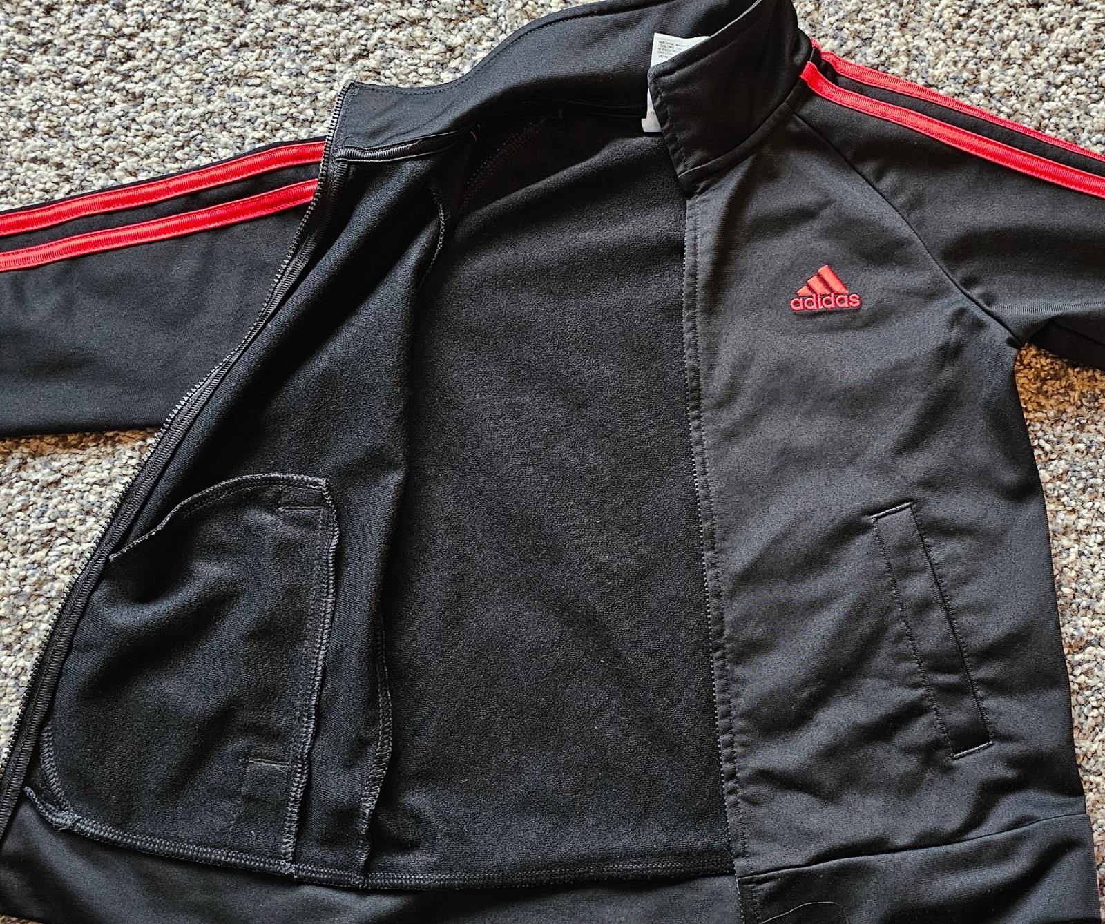 как выглядит Adidas Boys Size 5 Track Full Zip-Up Jacket Black Red Logo 2 Stripes фото