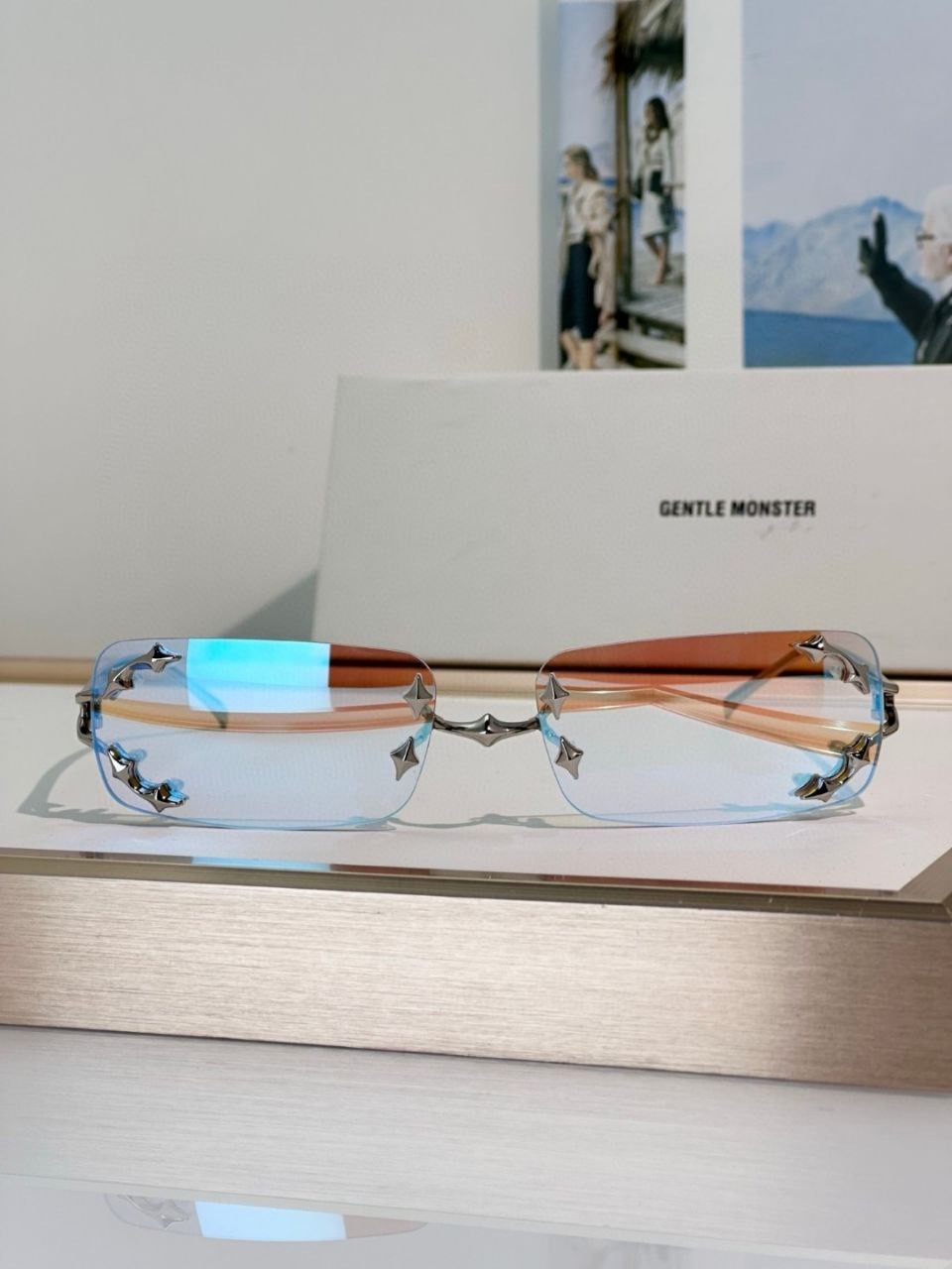 как выглядит Gentle Monster MOSH Rimless Sunglasses Titanium Frame Blue Gradient Lens Unisex фото