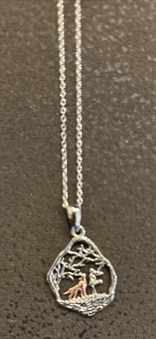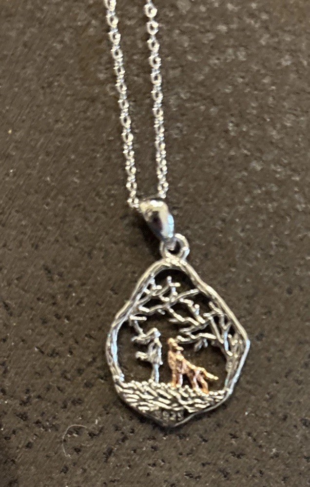 Wolf/Girl Silvertone/Goldtone Necklace. Adjustable, 2-sided, used, in ex. cond.