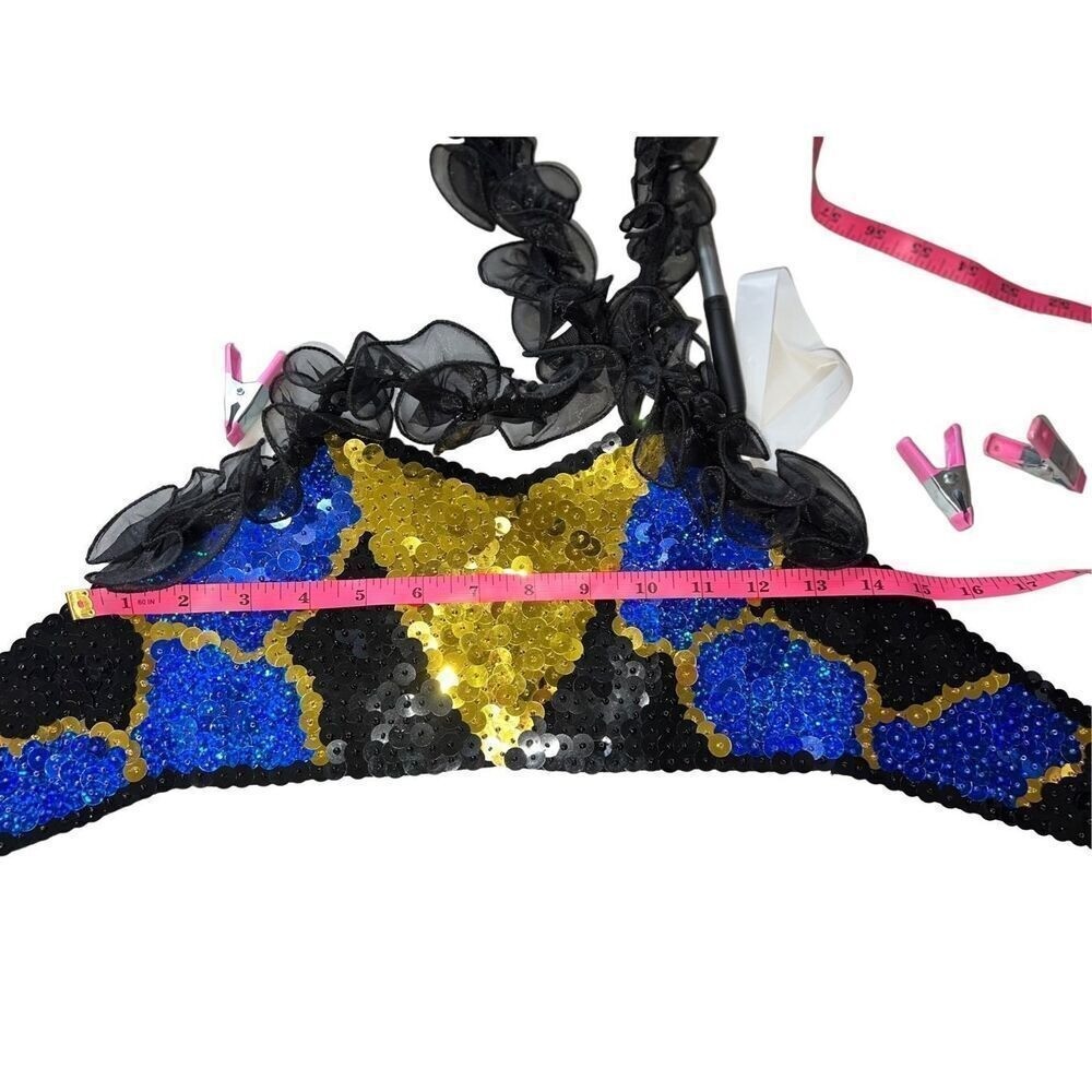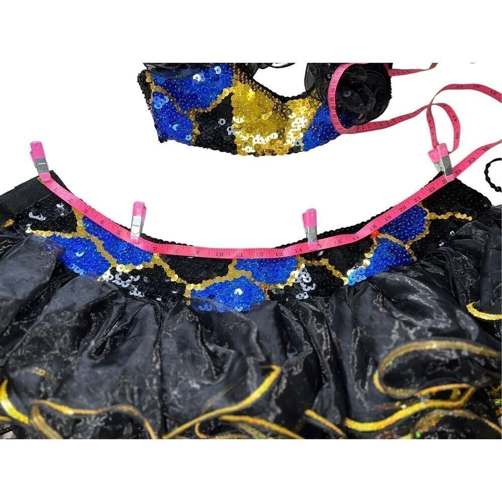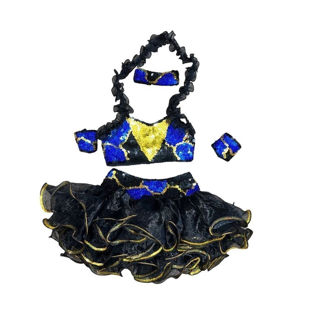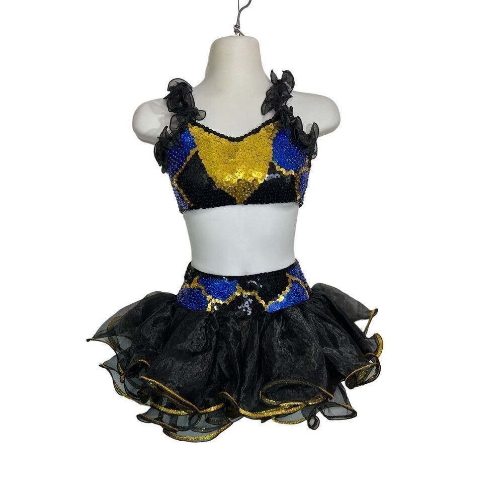Black Gold Dance Cheer Pageant Costume Sequins Girls Medium CM 6pc Halter Tutu