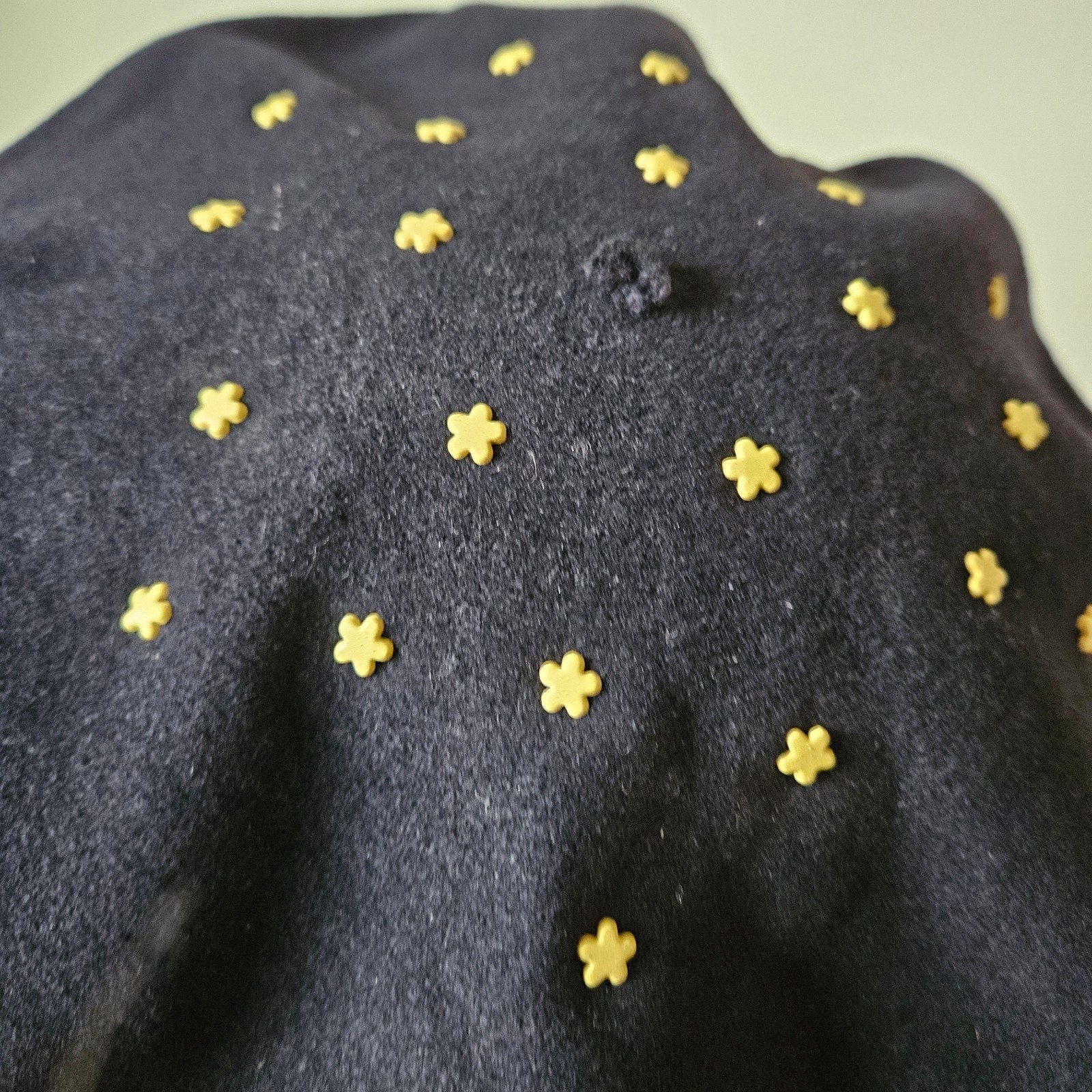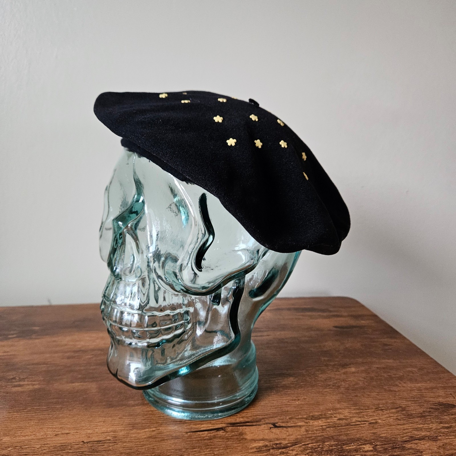 Vintage Black 100 Wool Felt 60s 70s Daisy Flower Power Studded Beret Hat Cap