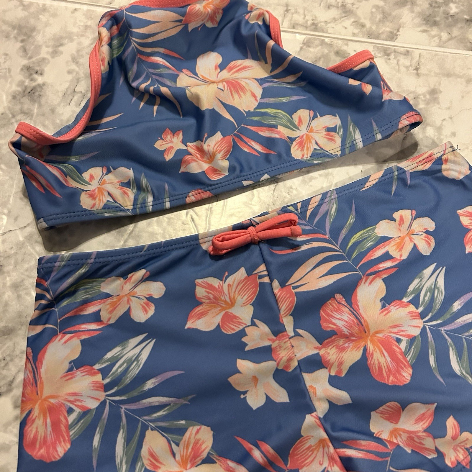 как выглядит Girls Wonder Nation 2pc Blue Pink Flowers Halter Shorts Bathing Suit Size 10-12 фото