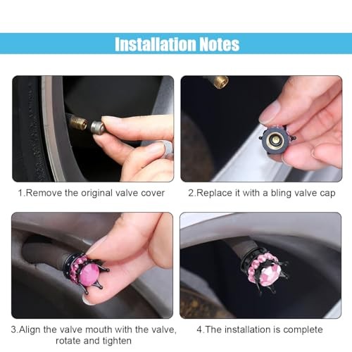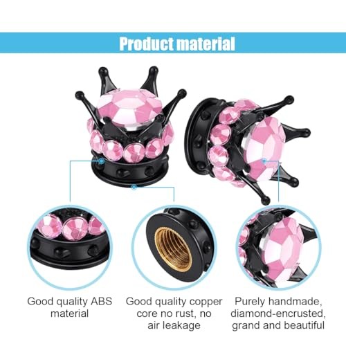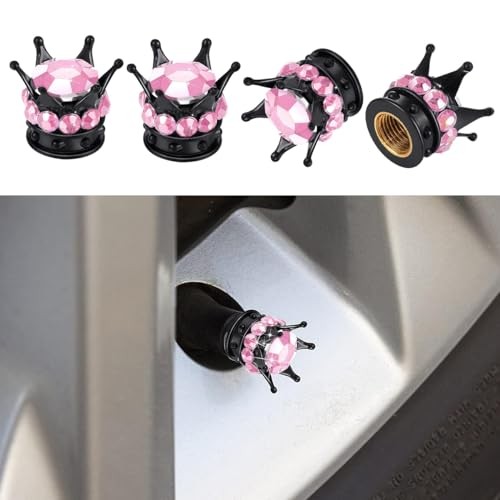 4PCS Crown Tire Valve Stem Caps, Bling Handmade Crystal Rhinestone Pink Black