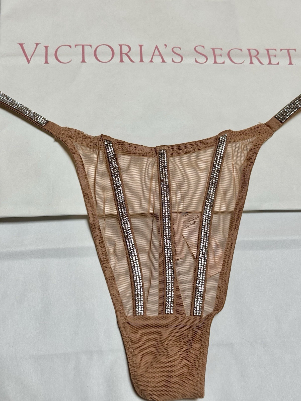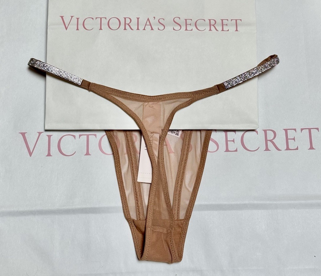 NEW Victoria s Secret Rhinestone Shine Strap Mesh Thong Panty Nude Beige Size S