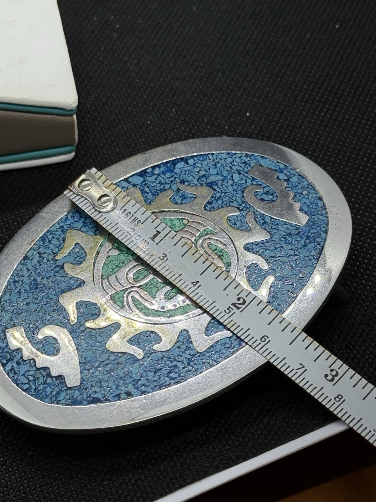 как выглядит Vintage Sterling Silver Belt Buckle Turquoise Sun Hecho En Mexico 3.5" 64g фото