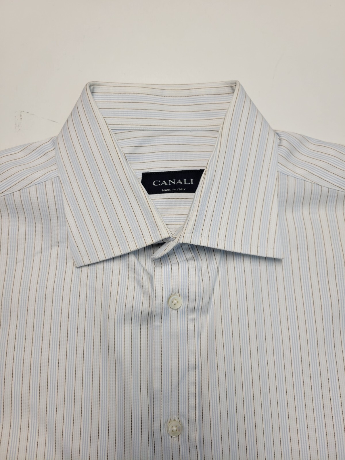как выглядит CANALI Striped Button Dress Shirt Mens 17 EU 43 XL White Blue Tan French Cuff фото