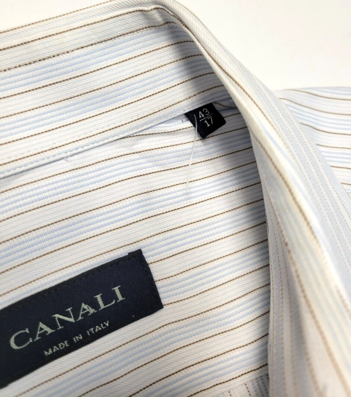 CANALI Striped Button Dress Shirt Men's 17 EU 43 XL White Blue Tan French Cuff
