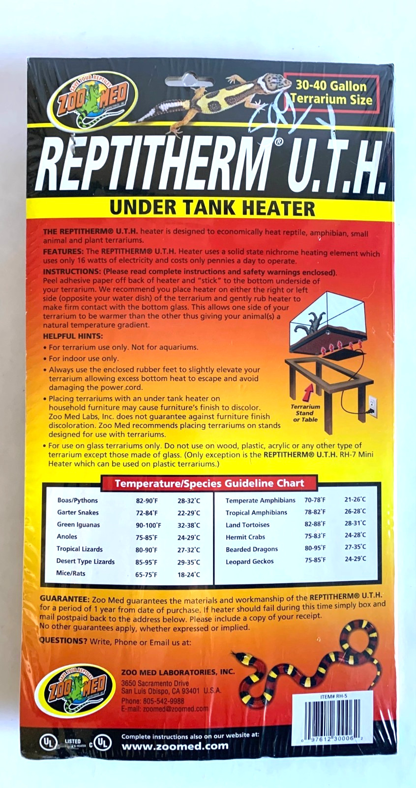 New Sealed Zoo Med ReptiTherm UTH Under Tank Heater 30-40 Gallon Terrarium RH-5