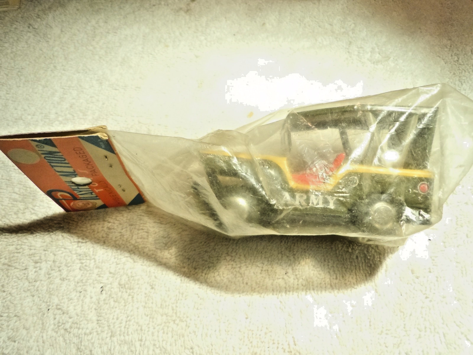 как выглядит 4 INCH JAPANESE TIN JEEP TOY IN ITS ORIGINAL, UNOPENED, PLASTIC BAG TAG фото