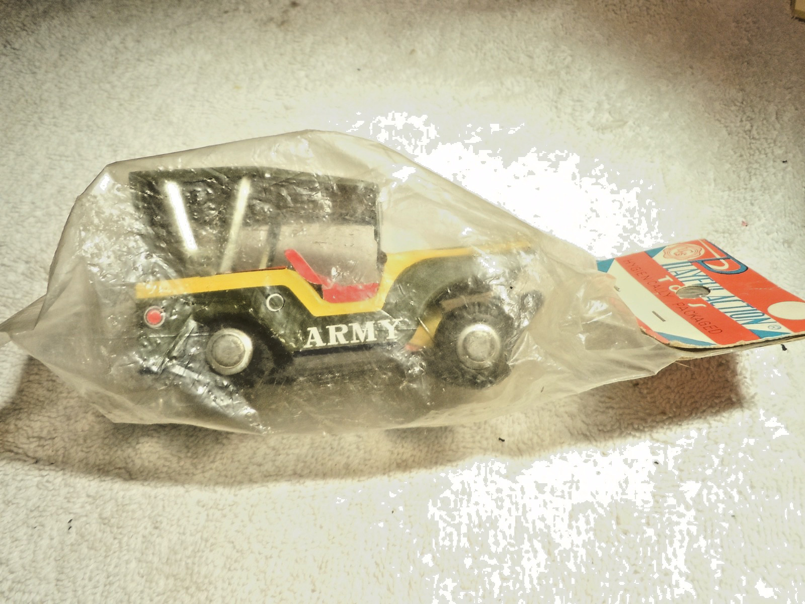 4 INCH JAPANESE TIN JEEP TOY IN ITS ORIGINAL, UNOPENED, PLASTIC BAG TAG