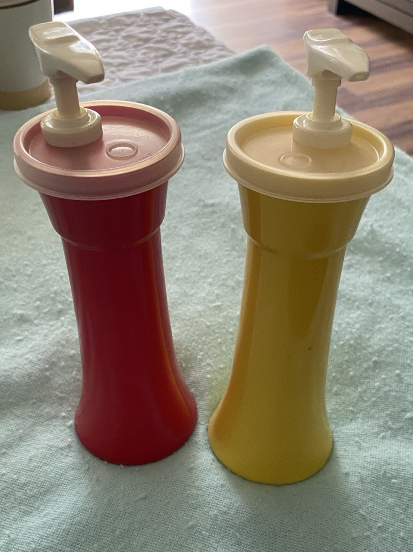 • Vintage Tupperware Ketchup and Mustard Pump Dispensers With Lids