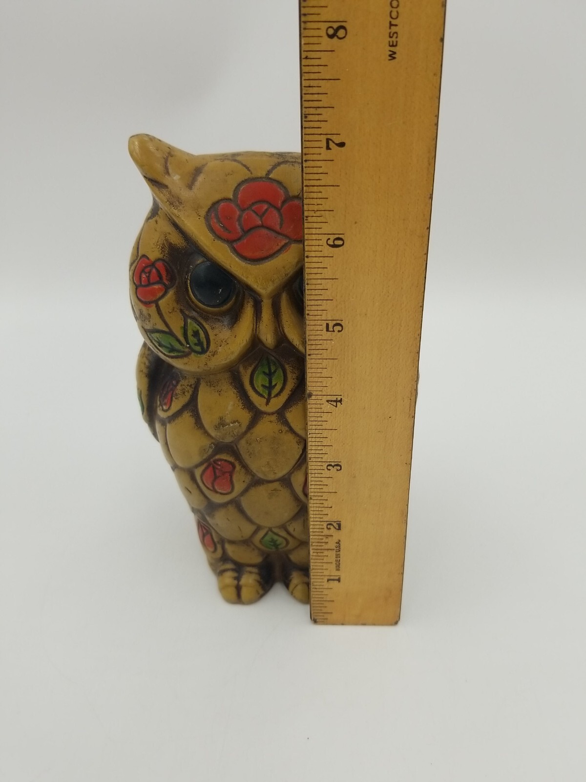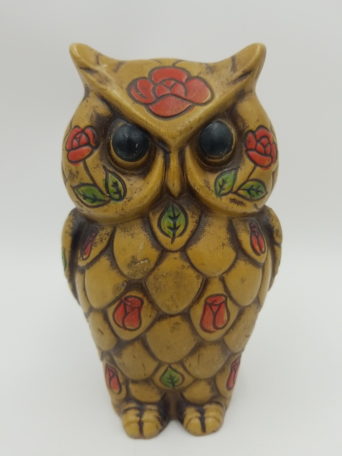 • Vintage Retro Brown Owl Coin Bank with Red Roses Green Leaves and Stopper