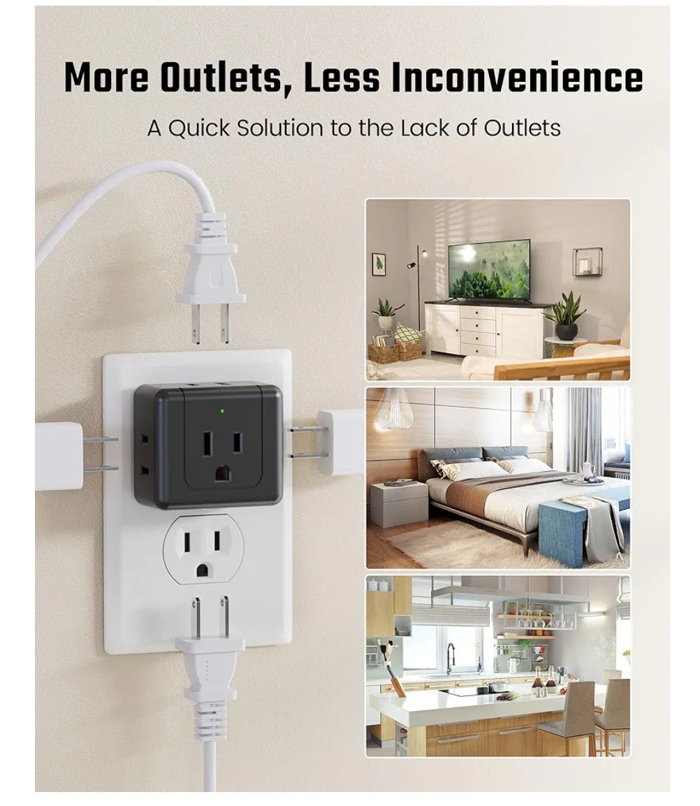 как выглядит SUPERDANNY Wall Outlet Extension Plug 5 Way Splitter Extender - 2 Pack - Black фото