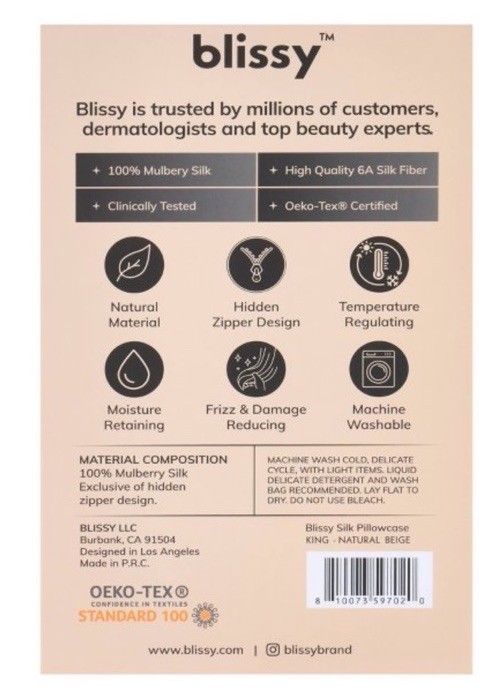 Blissy 100 Silk Mayberry Pillowcase 600 Thread Count- Natural beige