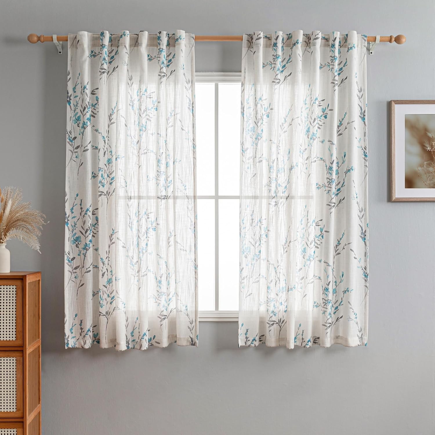 Sheer Curtains 63 Inch Length 2 Panels for Bedroom Floral Natural Linen Blend...
