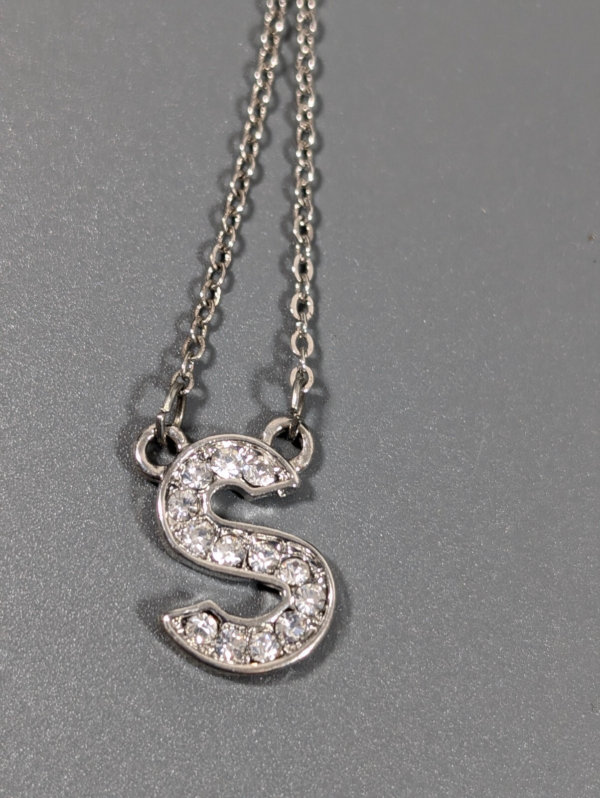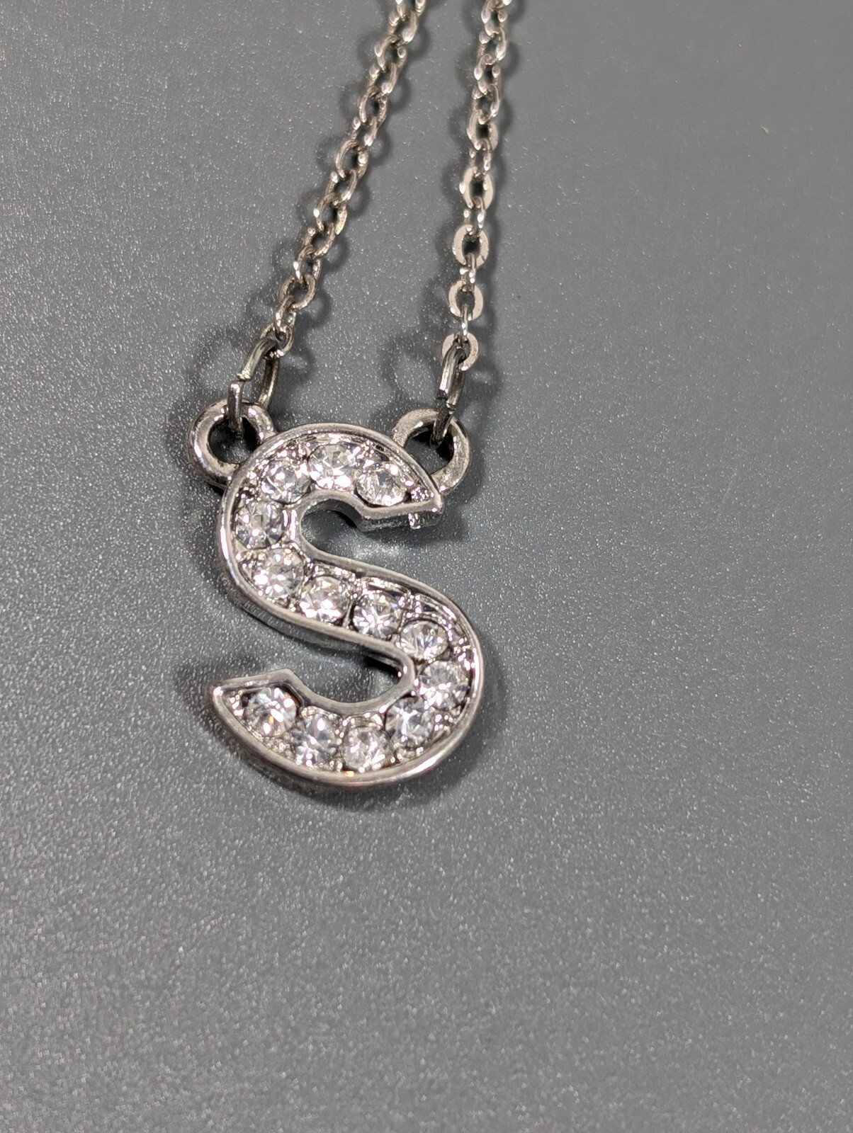 Initial Letter S Rhinestone Small Charm Silver Tone Necklace 20 in