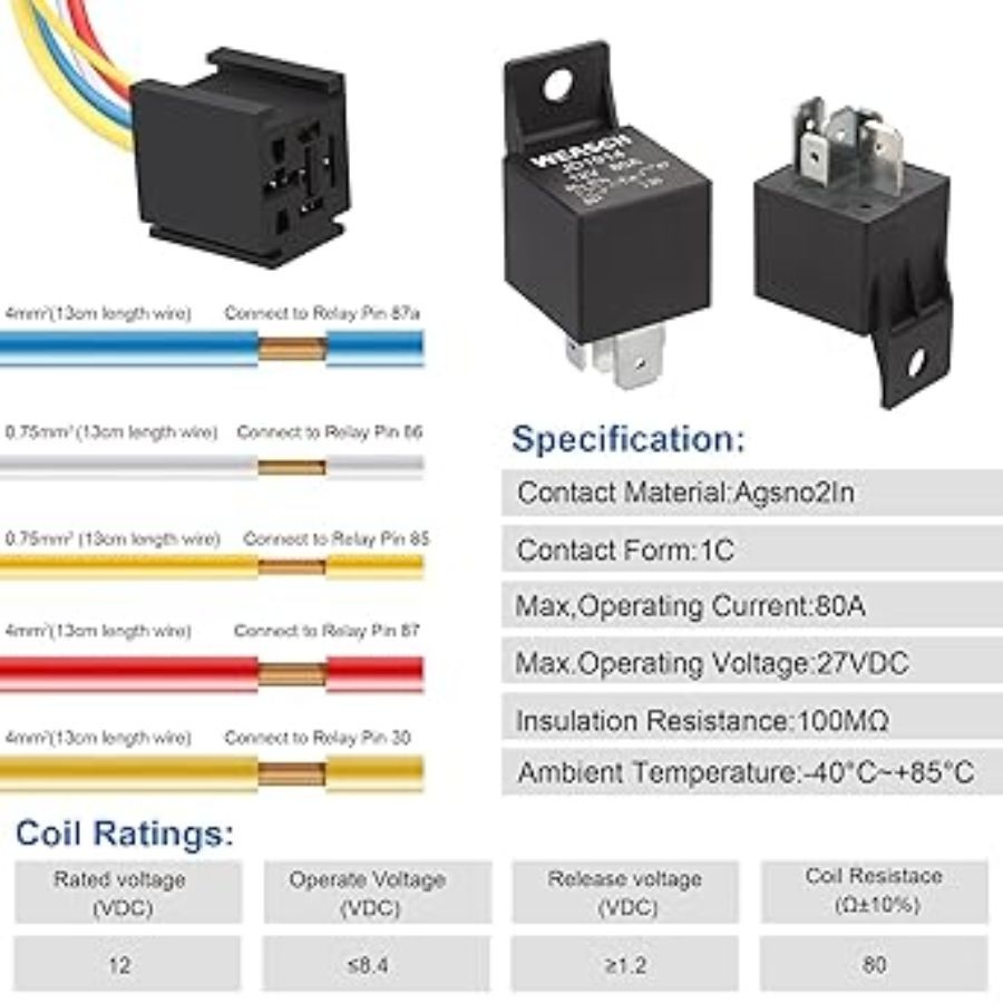 12V 80A Heavy Duty Relay with Harness, 5-Pin SPDT, 5 Wire Automotive Relay,